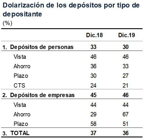En el segmento de personas, los depósitos de CTS, a plazo y de ahorro alcanzaron una dolarización de 21%, 27% y 33%, respectivamente, con caídas de tres puntos porcentuales en los tres casos en el 2019.