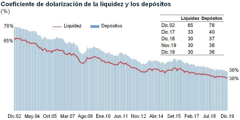 La dolarización de la liquidez fue de 30% en diciembre del 2019, similar al registrado al cierre del 2018.