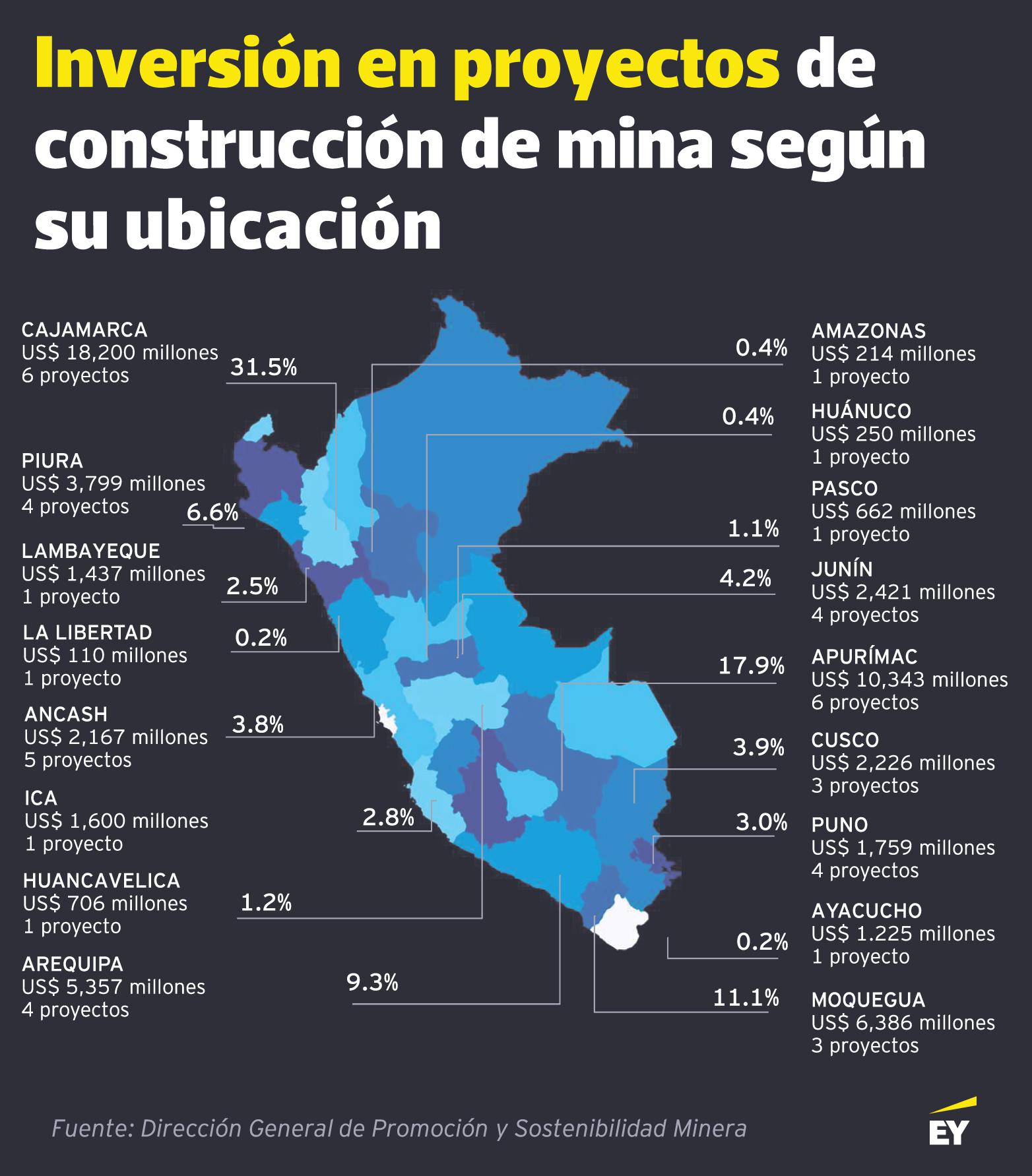 Del monto total de inversiones, Cajamarca, Apurímac, Moquegua y Arequipa concentran el 69.8%.