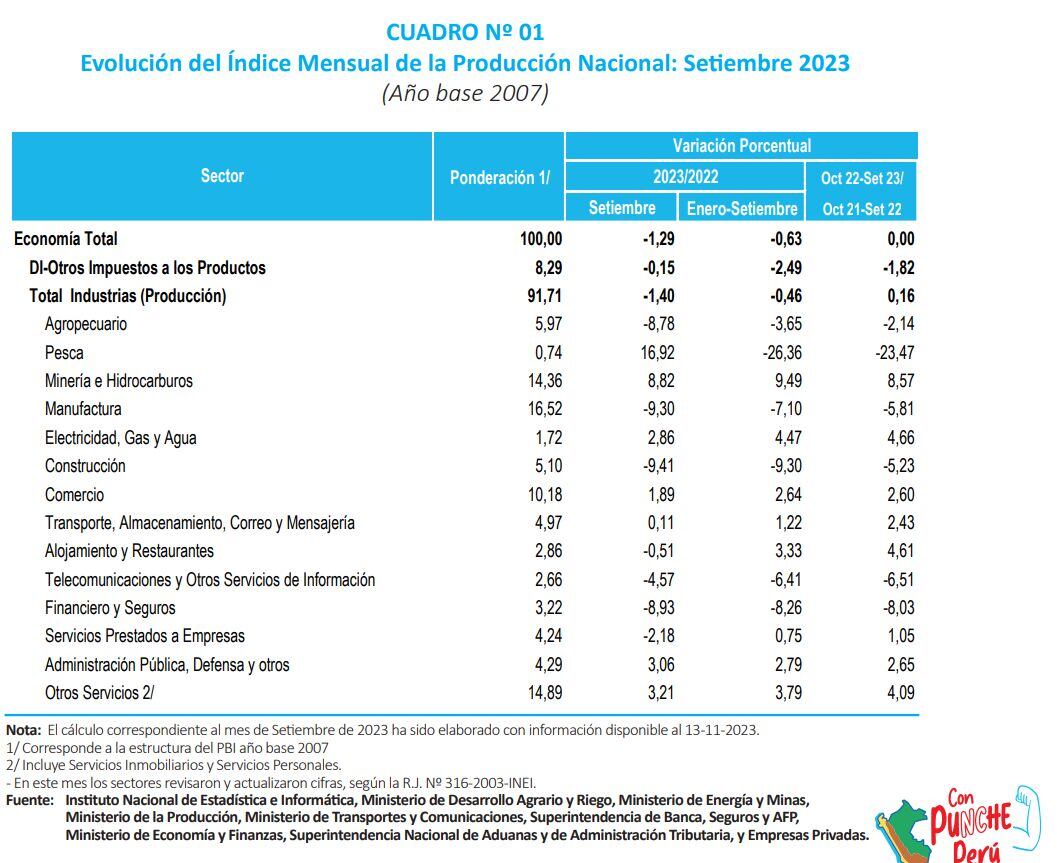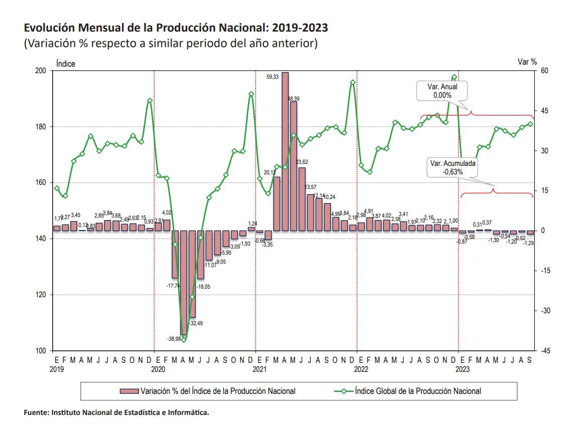 En el informe técnico también indicó que, entre enero-septiembre 2023 la economía nacional se contrajo en 0.63% y en el periodo anualizado (octubre 2022-setiembre 2023) no mostró variación con relación al nivel observado en octubre 2021-septiembre 2022.