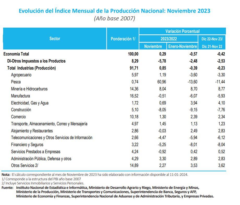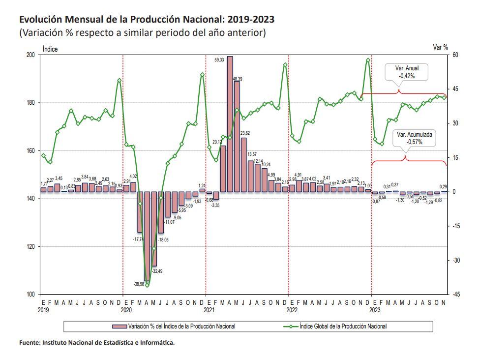 La economía peruana se abre paso para una posible recuperación tras seis meses en “rojo”. En noviembre del 2023, la producción nacional se incrementó en 0.29%, respecto a similar mes del 2022, informó el Instituto Nacional de Estadística e Informática (INEI).