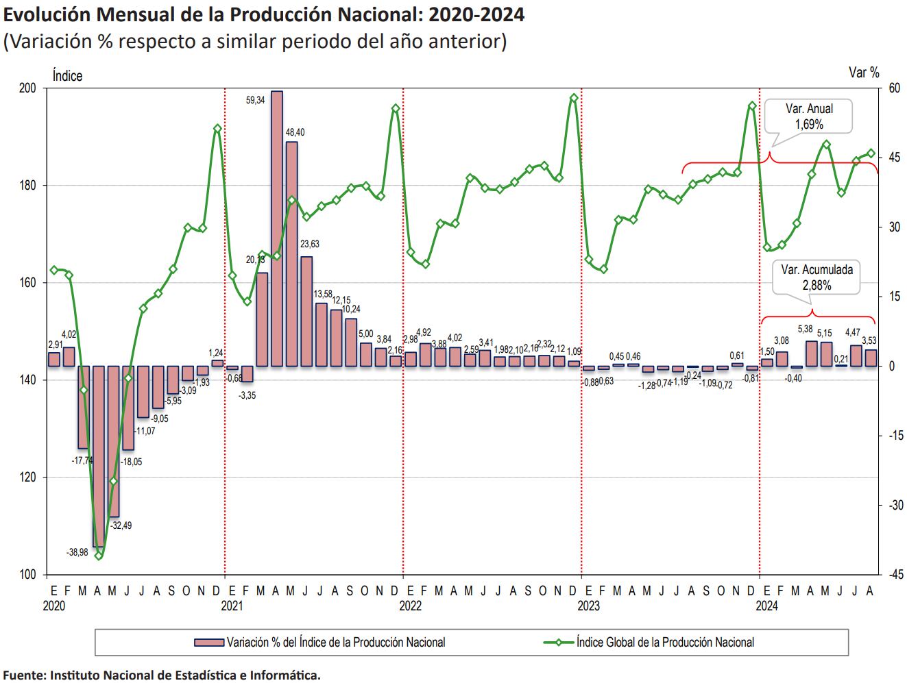 La economía peruana creció 2.53% en agosto, según los datos del Instituto Nacional de Estadística e Informática (INEI). Con esto, se alcanza su quinto mes en positivo, aunque se desaceleró respecto a julio (4.47%).