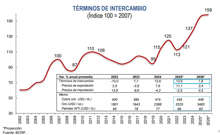 Las condiciones externas continúan tornándose positivas para la economía peruana, incidiendo puntualmente sobre los términos de intercambio comercial. El Banco Central de Reserva del Perú (BCRP) proyectó que el índice alcanzaría los 159 puntos en el 2026, según su último reporte de inflación.