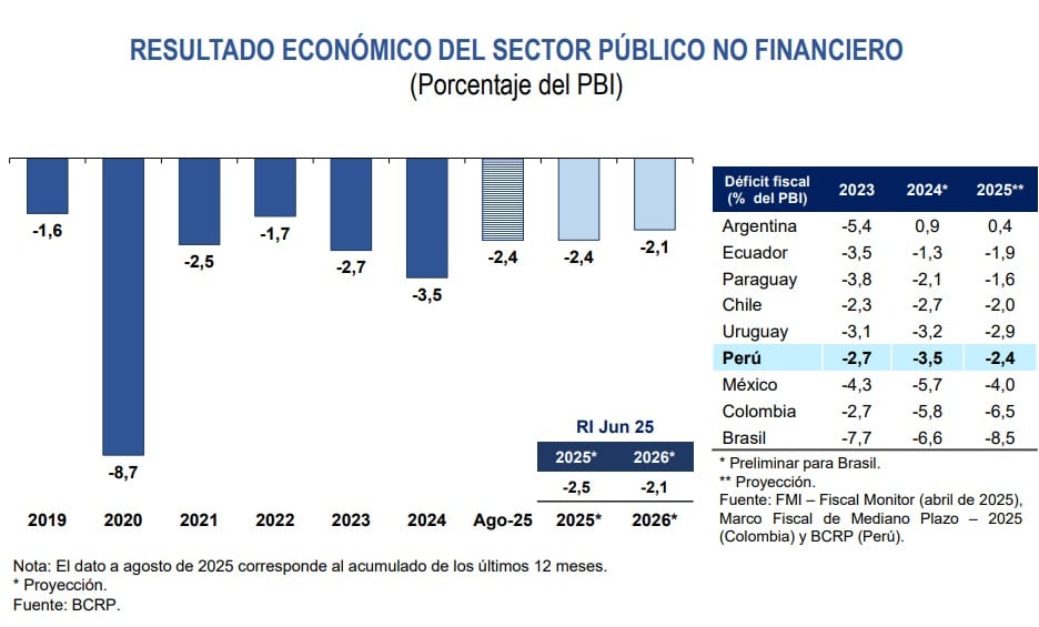 De otro lado, la entidad monetaria estimó que el déficit fiscal sería de 2.4% de Producto Bruto Interno (PBI) en este 2025 y de 2.1% en el 2026, casi sin mostrar variaciones frente a su pronóstico de junio.