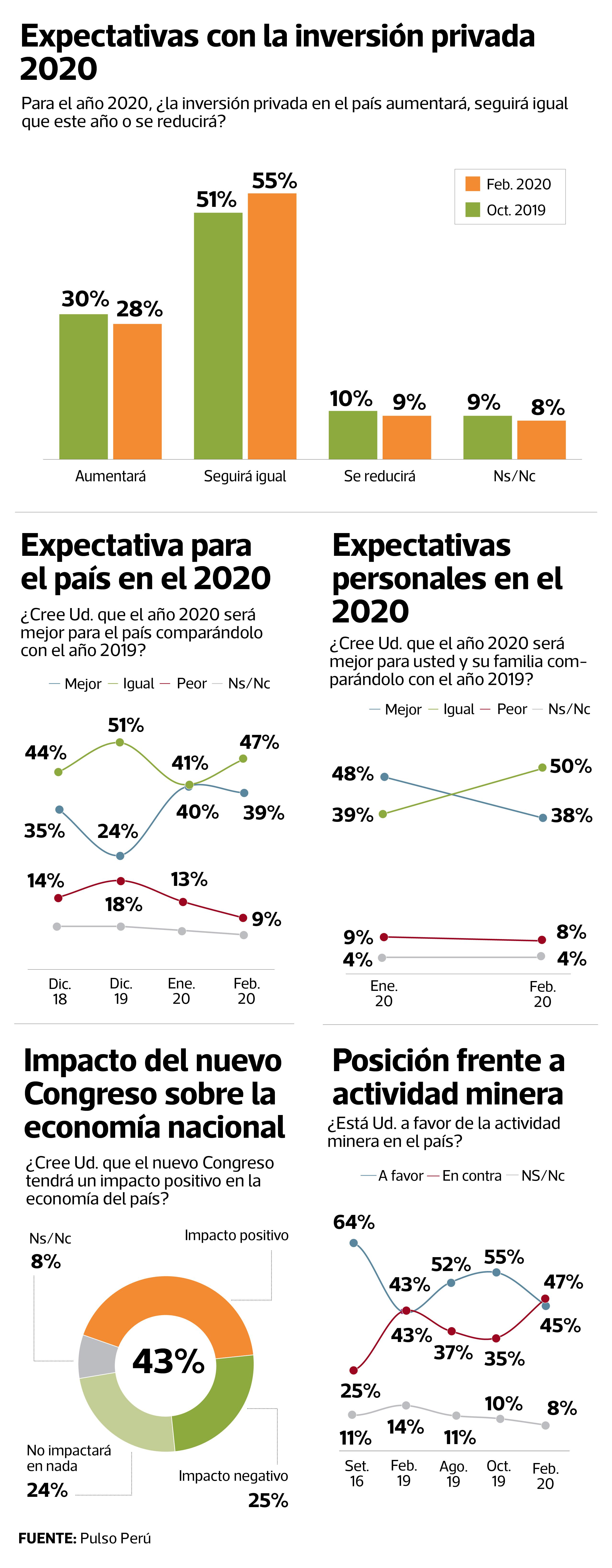 El 56% de peruanos cree que no habrá mejoría de la economía. De estos, el 47% cree que seguirá igual y un 9% que estará peor. Hay un 39% más optimista que cree que sí habrá una mejora.