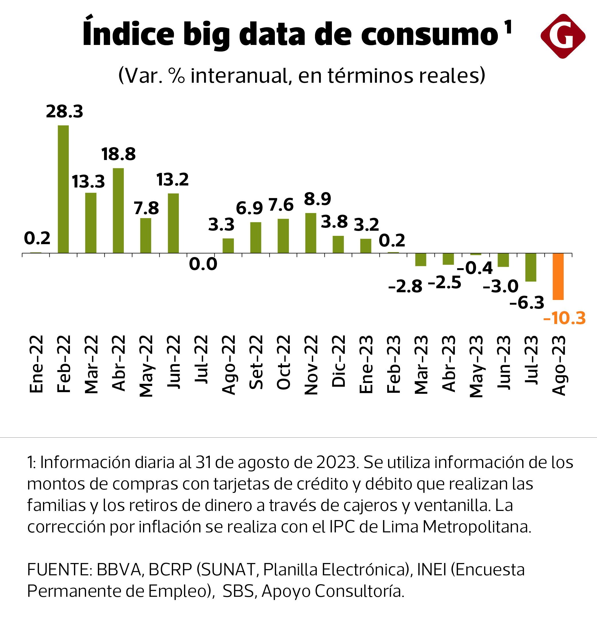El deterioro de la capacidad adquisitiva de las familias peruanas se sigue reflejando en diversos indicadores. Esta vez, el Índice Big Data de Consumo para Perú, elaborado sobre la base del gasto con tarjetas -de crédito y débito- y retiros de efectivo, corregido por inflación, registró su caída más dramática en lo que va del año.