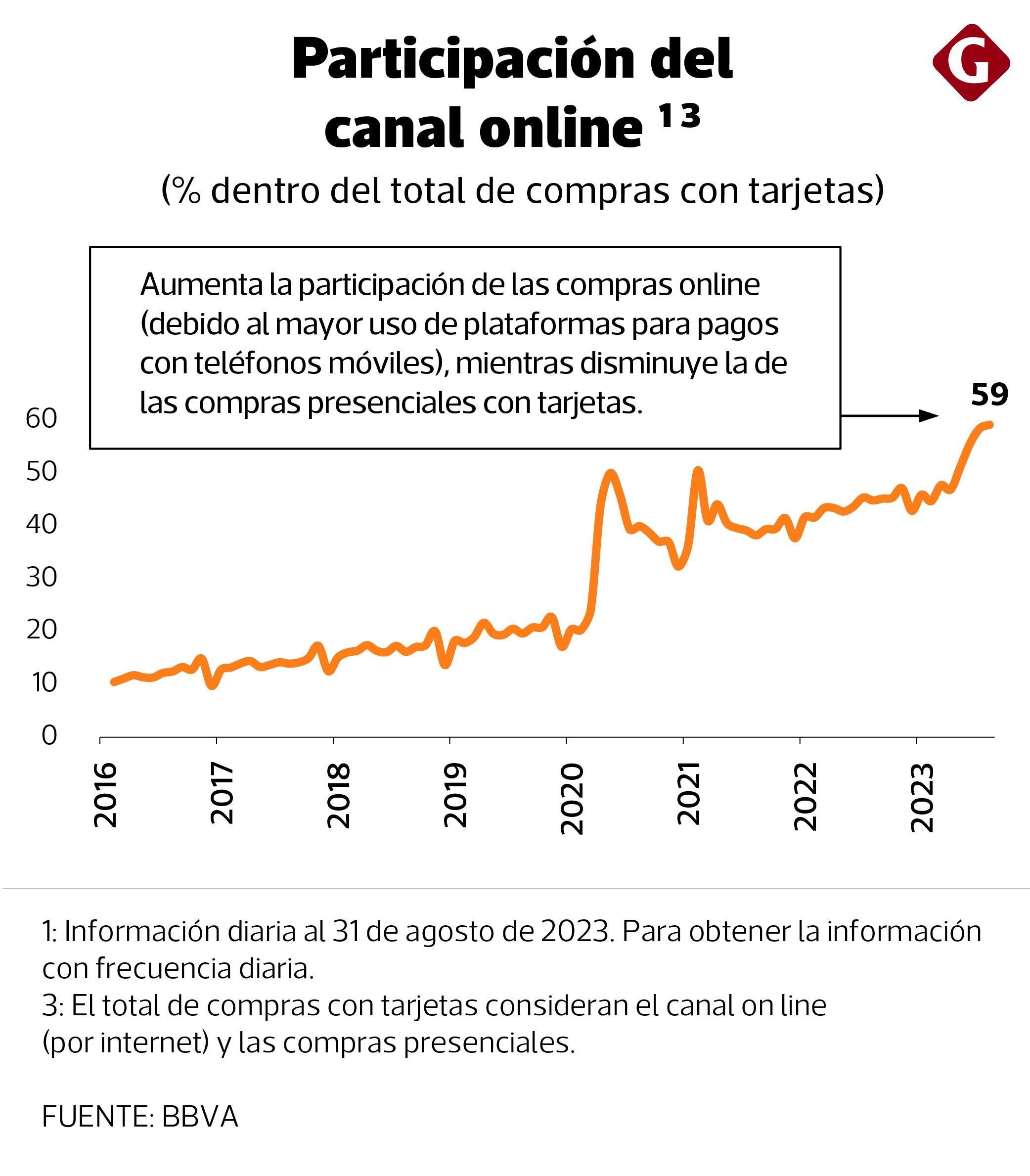 Pese a este escenario, un indicador que sigue creciendo sin dar señales de moderación es la digitalización del consumo. El porcentaje de compras realizadas con tarjetas sobre el gasto total alcanzó un nuevo máximo de 51%. Por su parte, la participación del canal online como porcentaje del total de compras con tarjeta también alcanzó un nuevo máximo en agosto: 59%.