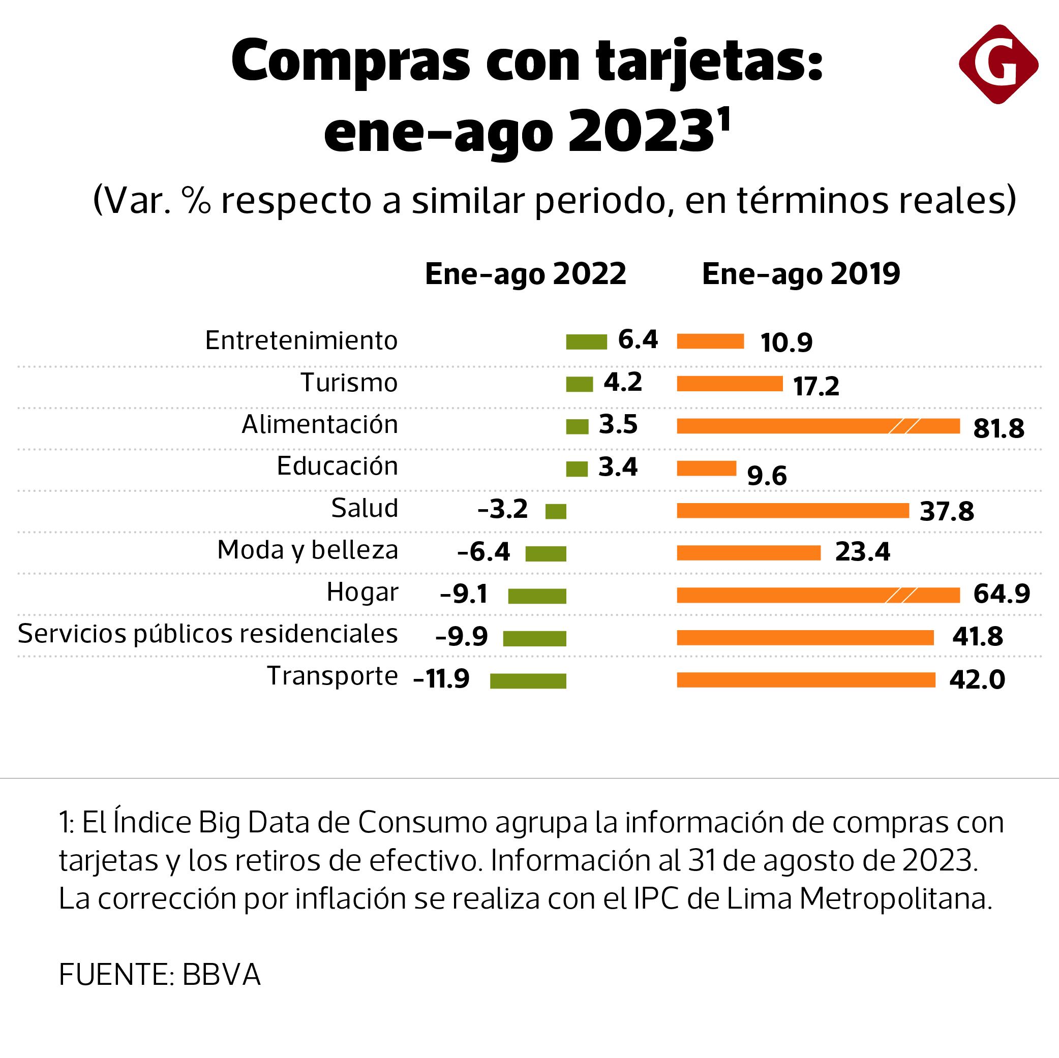 Al analizar el gasto con tarjeta de crédito o débito que realizan las familias, aunque se ve un deterioro transversal a todas las categorías de consumo en el mes de agosto, hay cuatro que se han mostrado resilientes en los primeros ocho meses del año: entretenimiento, turismo, alimentación y educación. Los cuatro registran incrementos -en términos reales- respecto a similar periodo del 2022.