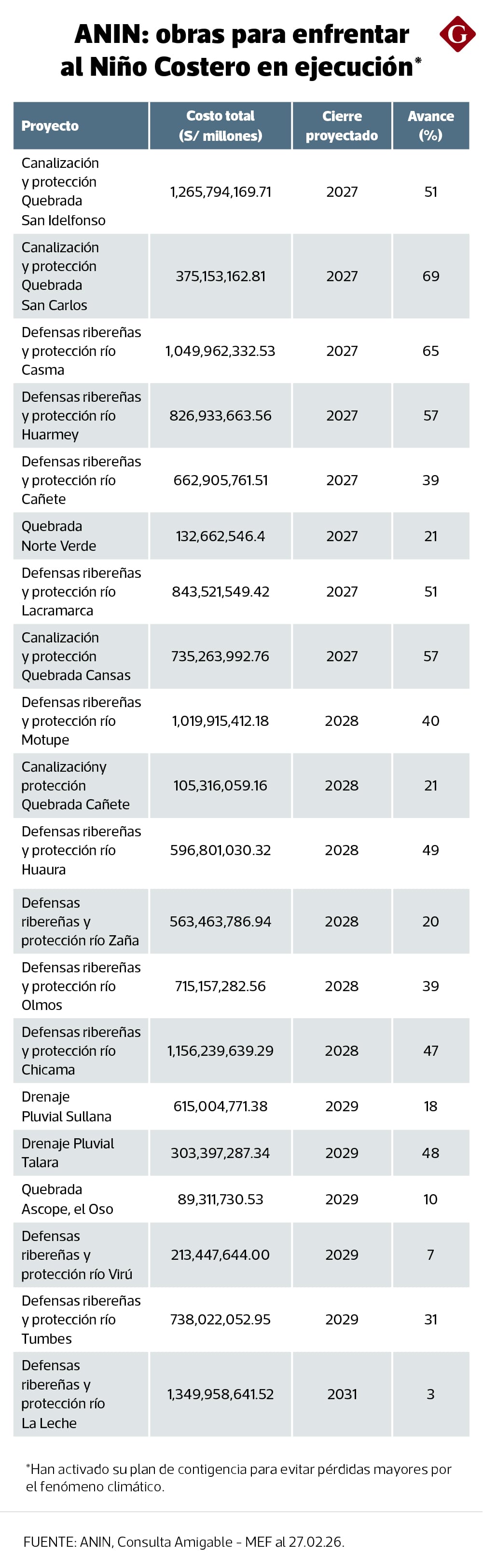 Debido a un déficit presupuestal que la ANIN dice arrastrar desde mediados del 2025, tienen 29 obras, todas para mitigar golpes de fenómenos climáticos como el fenómeno de El Niño (FEN), paralizadas. Para reactivarse aguardan un desembolso del Ministerio de Economía y Finanzas (MEF). Mientras, esperan que el FEN no dañe lo ya avanzado porque las obras volverían a elevar sus costos.
