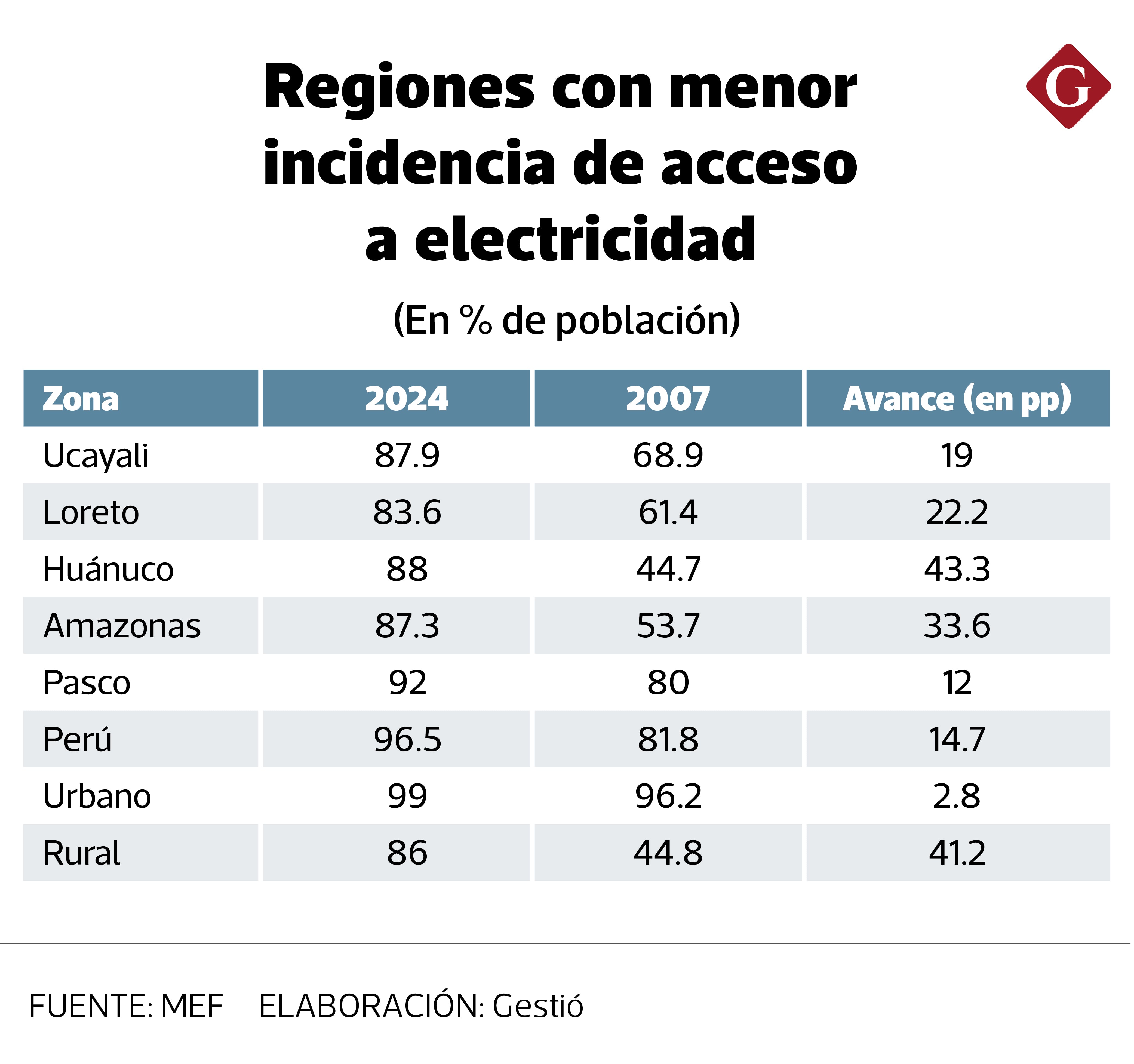 Según el INEI, la proporción de la población que tiene acceso a la electricidad es de 96.5% al cierre del 2024, representando un constante avance desde el 81.8% del 2007, cuando se empezó a reportar esta información, pero insuficiente.
