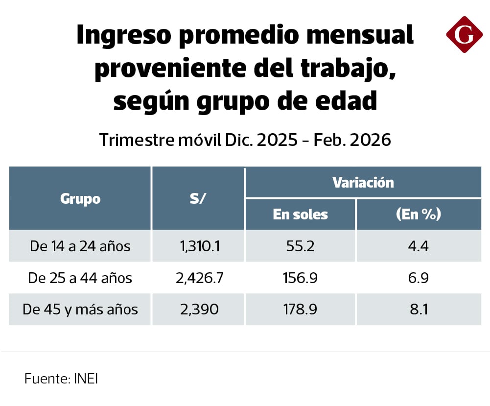 Otra muestra de esta condición es que, en el trimestre móvil a febrero, el ingreso laboral promedio ascendió a S/ 2,287, un crecimiento de 4.7% en términos reales (descontando la inflación) o equivalentes a S/ 102 adicionales frente a hace 12 meses.