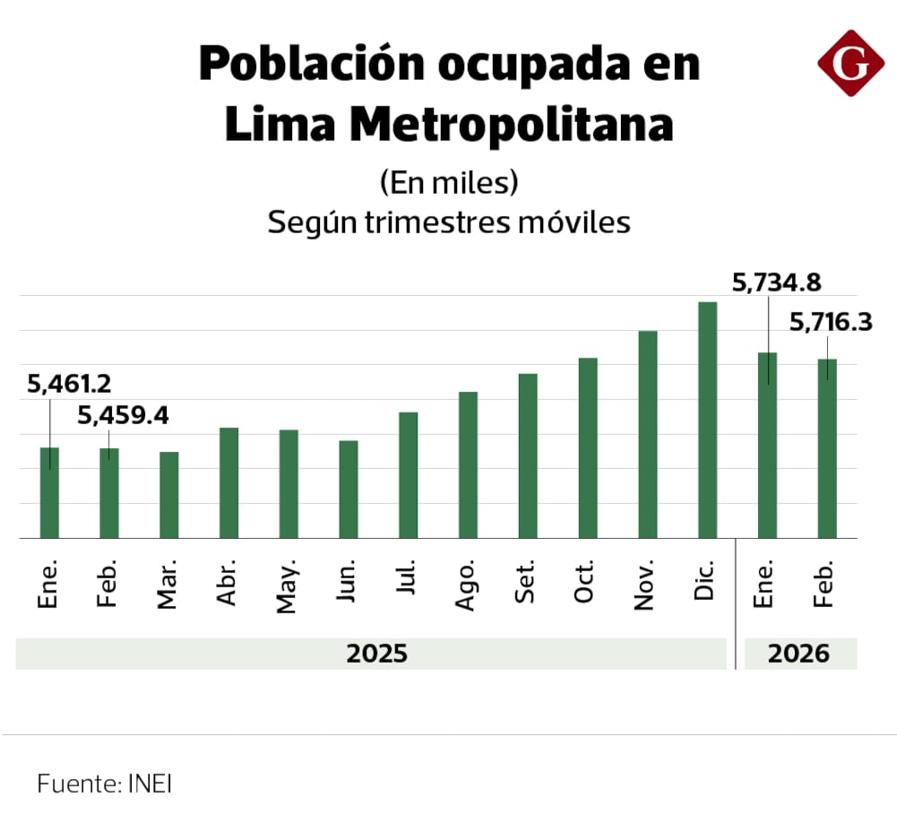 En Lima Metropolitana, la población ocupada (es decir, que cuenta con algún tipo de trabajo) registró un crecimiento de 4.7% en el trimestre móvil diciembre del 2025 a febrero del 2026.