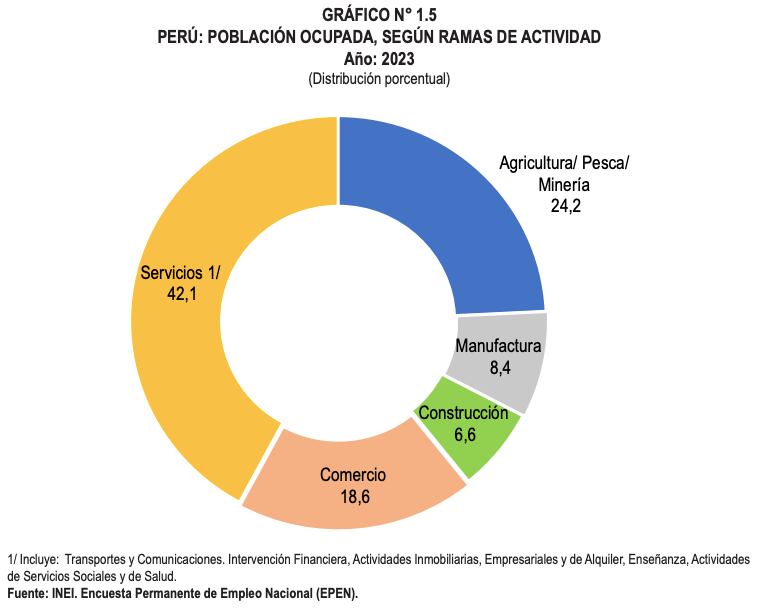 Según precisó el INEI, los rubros Servicios y Comercio concentran el 60.8% del total de la población ocupada en Perú, alcanzando en conjunto las 10,442 millones de personas. Los datos que brinda el EPEN, sin embargo, dejan saber que estos sectores fueron los únicos que registraron incrementos al cierre del 2023.