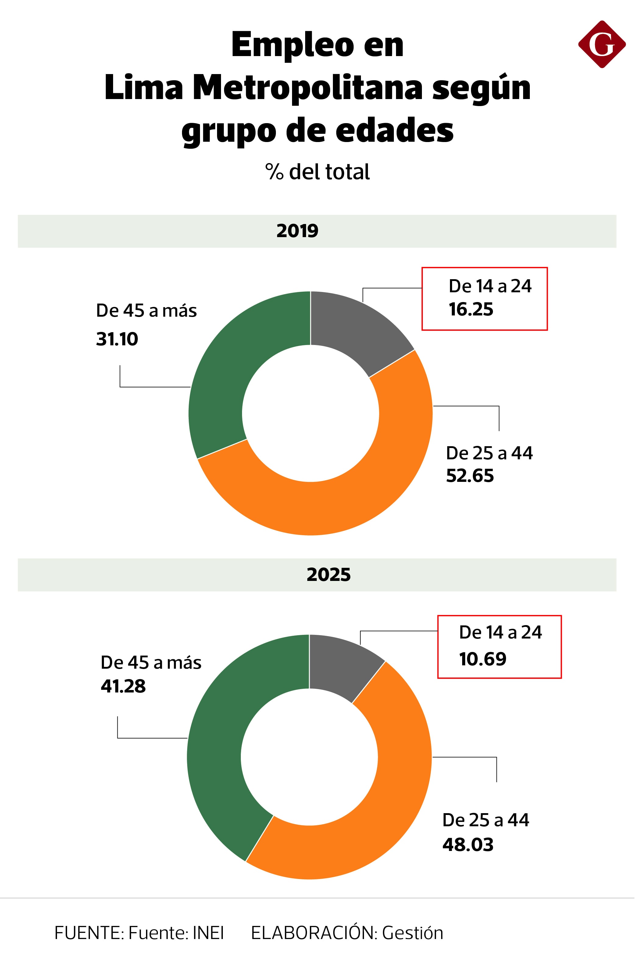A nivel de ocupados, en 2019, el grupo de entre 14 a 24 años representaba casi el 17% del total. Seis años después, los más jóvenes significan solo el 10% de los que cuenta con un empleo en Lima Metropolitana: uno de cada 10 trabajos lo ocupan ellos.