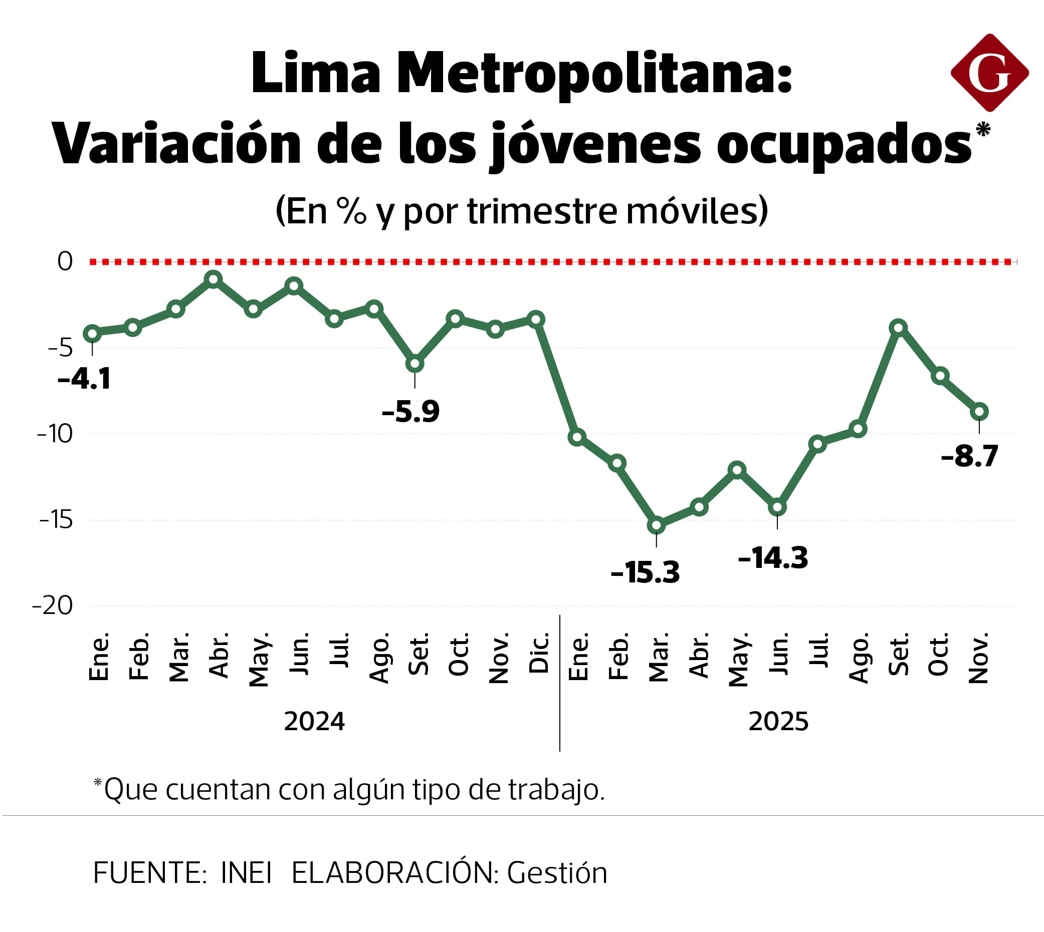 “Es complicado que veamos mejoras en el inicio del próximo año. Lo que sí notaríamos es que las tasas de retroceso serían en menor magnitud, pero es porque en la primera parte del 2025 tuvo caídas con tasas a doble dígito. En general, no se revertiría esta situación crítica para el empleo juvenil”, comentó.