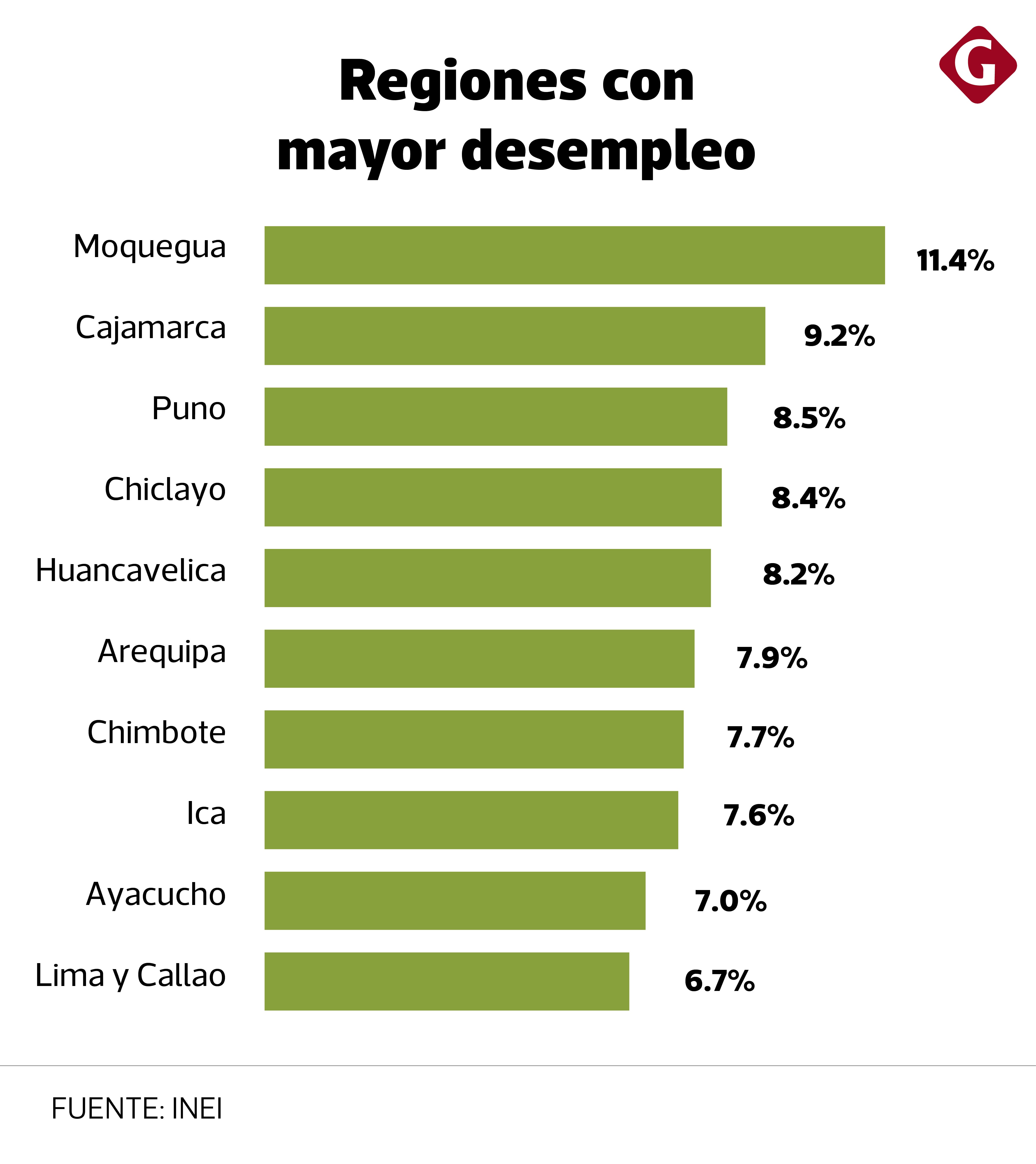 Las ciudades más golpeadas por el desempleo son Moquegua con tasas de desempleo de 11.4%, en Cajamarca de 9.2% y Puno de 8.5%.
