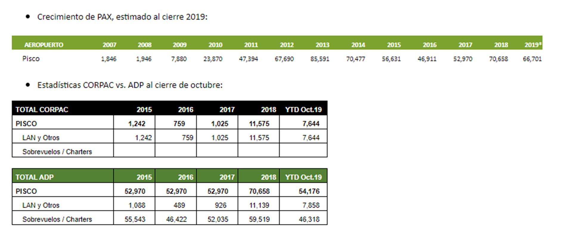 El vuelo estacional de Latam (Cusco-Pisco-Cusco) debe haber generado un flujo de pasajeros cercano a los 12,000 a 13,000 adicionales al Aeropuerto de Pisco en este último semestre, con una de tasa de ocupación del 80%. Esta aerolínea -cabe precisar- está pensando en aumentar frecuencias y eliminar la estacionalidad. Adicionalmente, esta es una ruta que ha estado muy por encima de las expectativas que teníamos inicialmente y es un vuelo que ha futuro continuará.