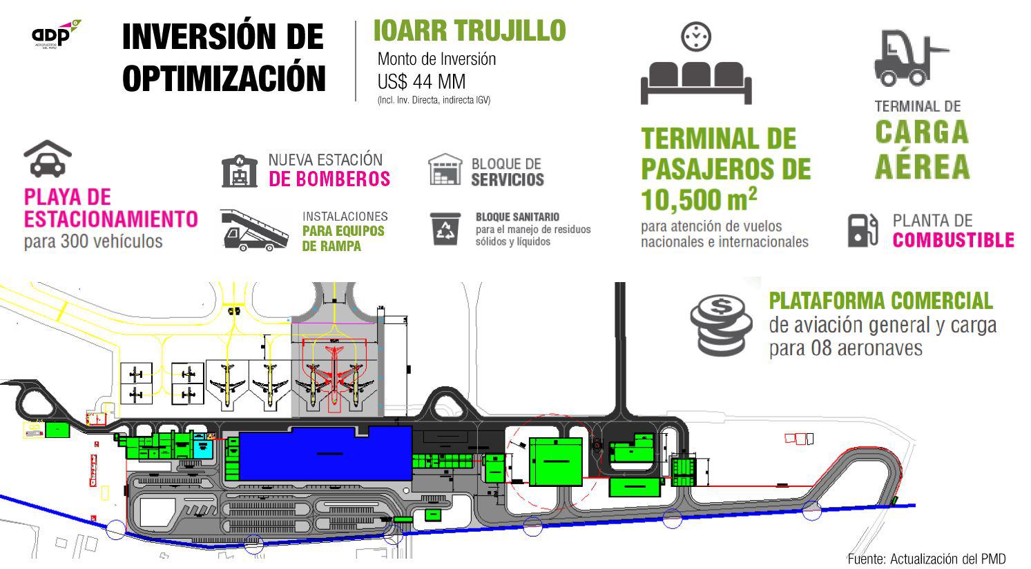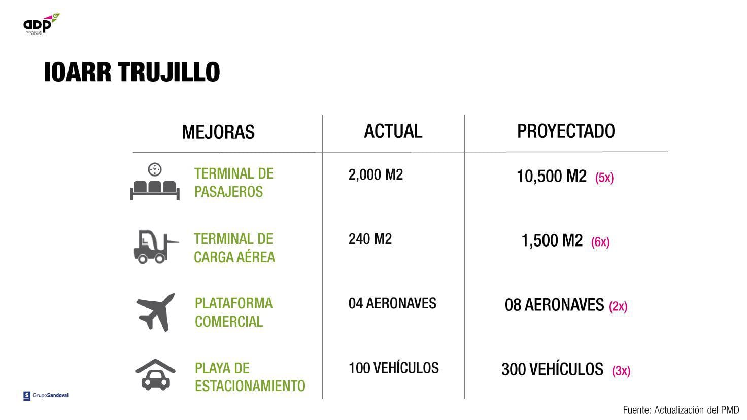 Aeropuertos del Perú (AdP), empresa perteneciente al Grupo Sandoval, suscribió el contrato con el consorcio INECO - CEMOSA para desarrollar el expediente técnico relacionado con la inversión del aeropuerto de Trujillo cuya construcción demandará una inversión aproximada de US$ 44 millones.