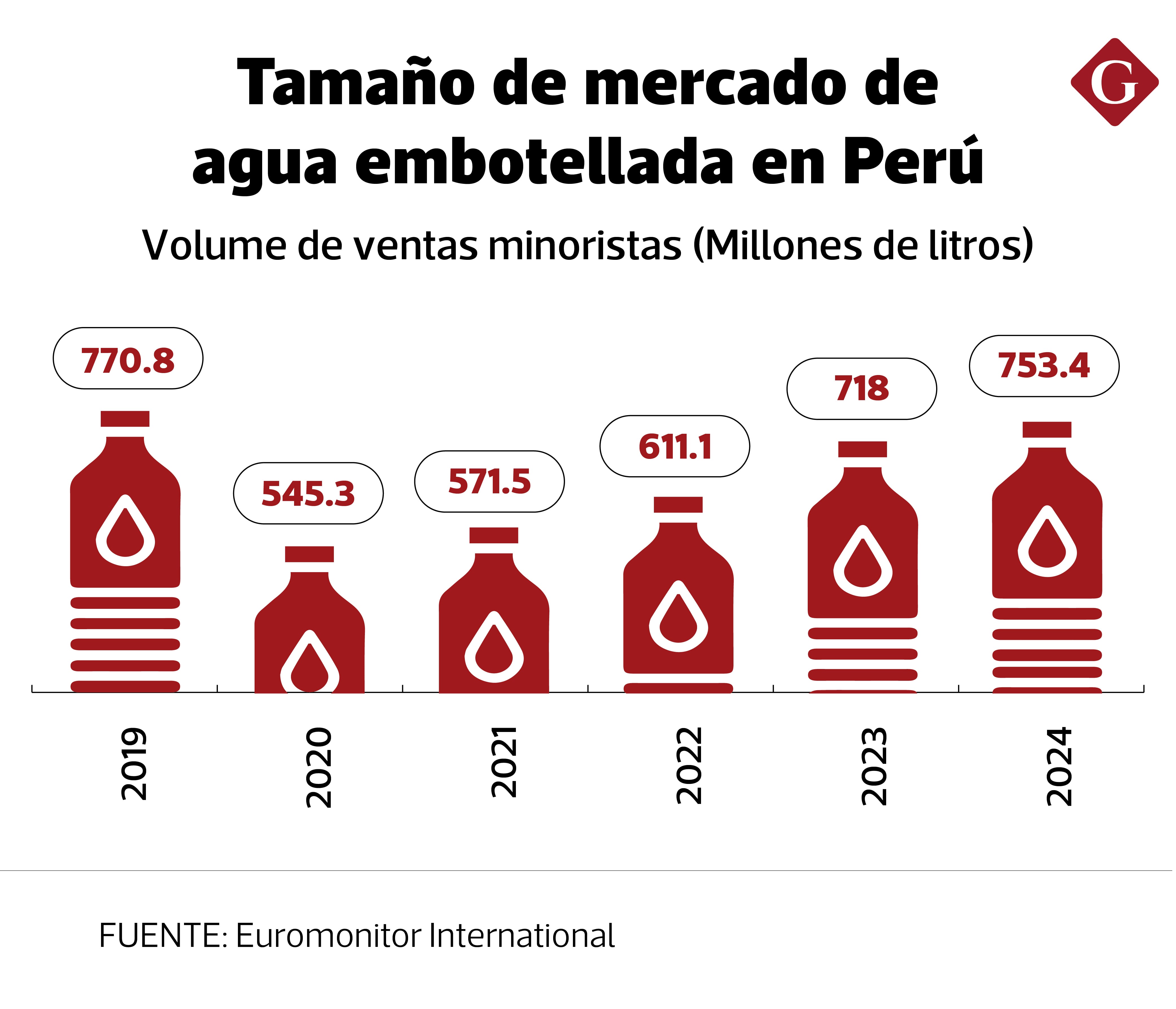 Según proyecciones de Euromonitor International, la categoría de agua embotellada en Perú moverá S/ 1,640 millones en 2025, lo que representa un incremento de 9% en comparación con 2023, cuando alcanzó los S/ 1,497 millones.
