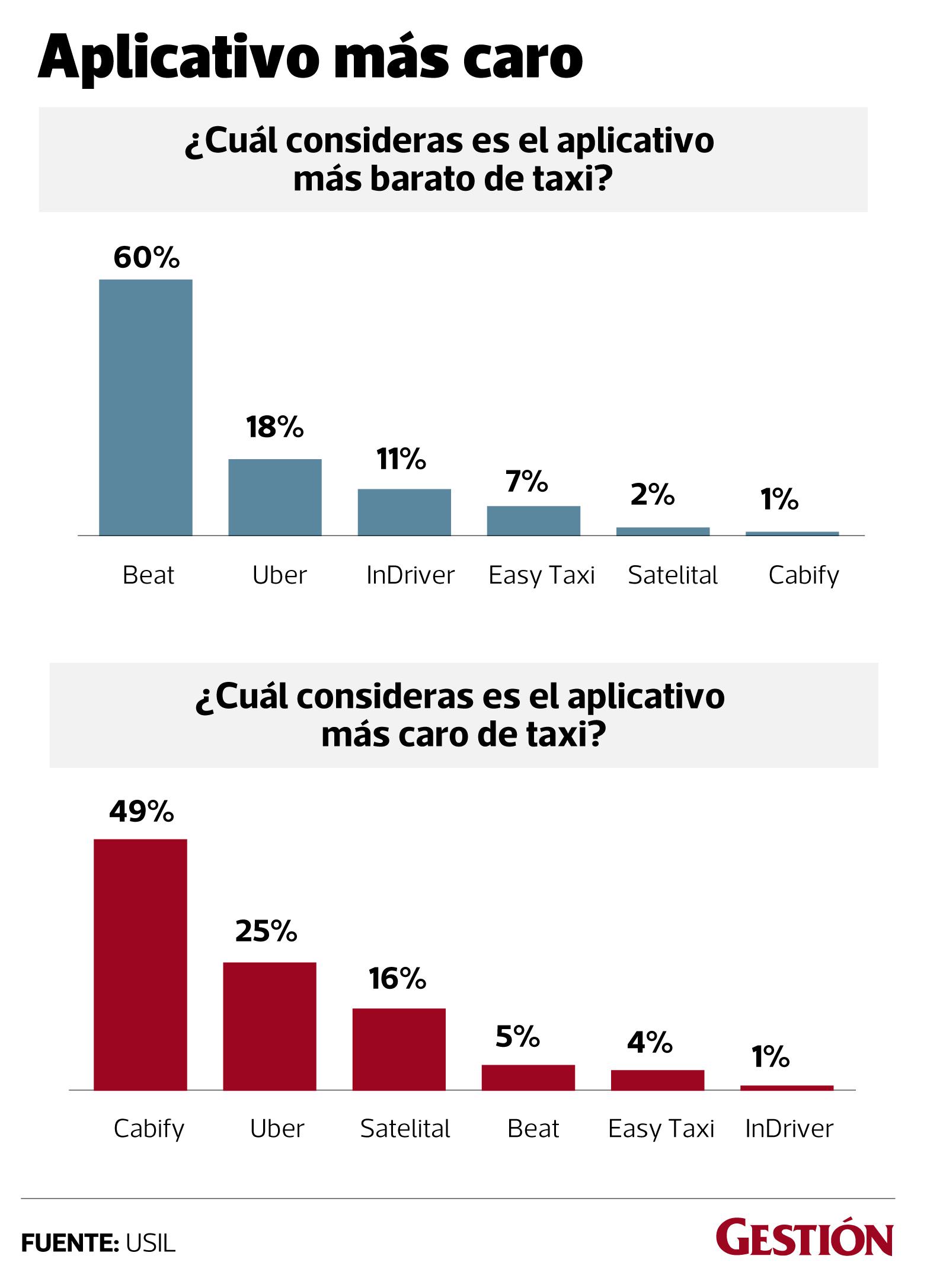 Una interrogante es el factor precio al momento de elegir una app. La consulta a los consumidores es ¿cuál es la aplicación más barata? Aquí nuevamente aparecen Beat y Uber liderando, pero la primera es considerada como la más económica (60%).