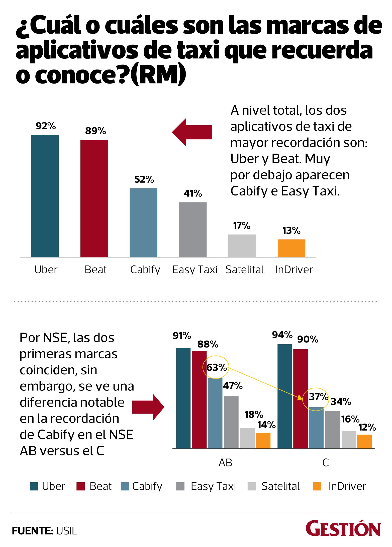 Un reciente estudio elaborado por los alumnos de la carrera de Marketing de la Universidad San Ignacio de Loyola (USIL) sobre los hábitos de uso de aplicativos móviles de taxi indica que de las seis marcas que los usuarios dicen recordar, dos (Uber y Beat) son las primeras que llegan a la mente del cliente, con un promedio de 90%.