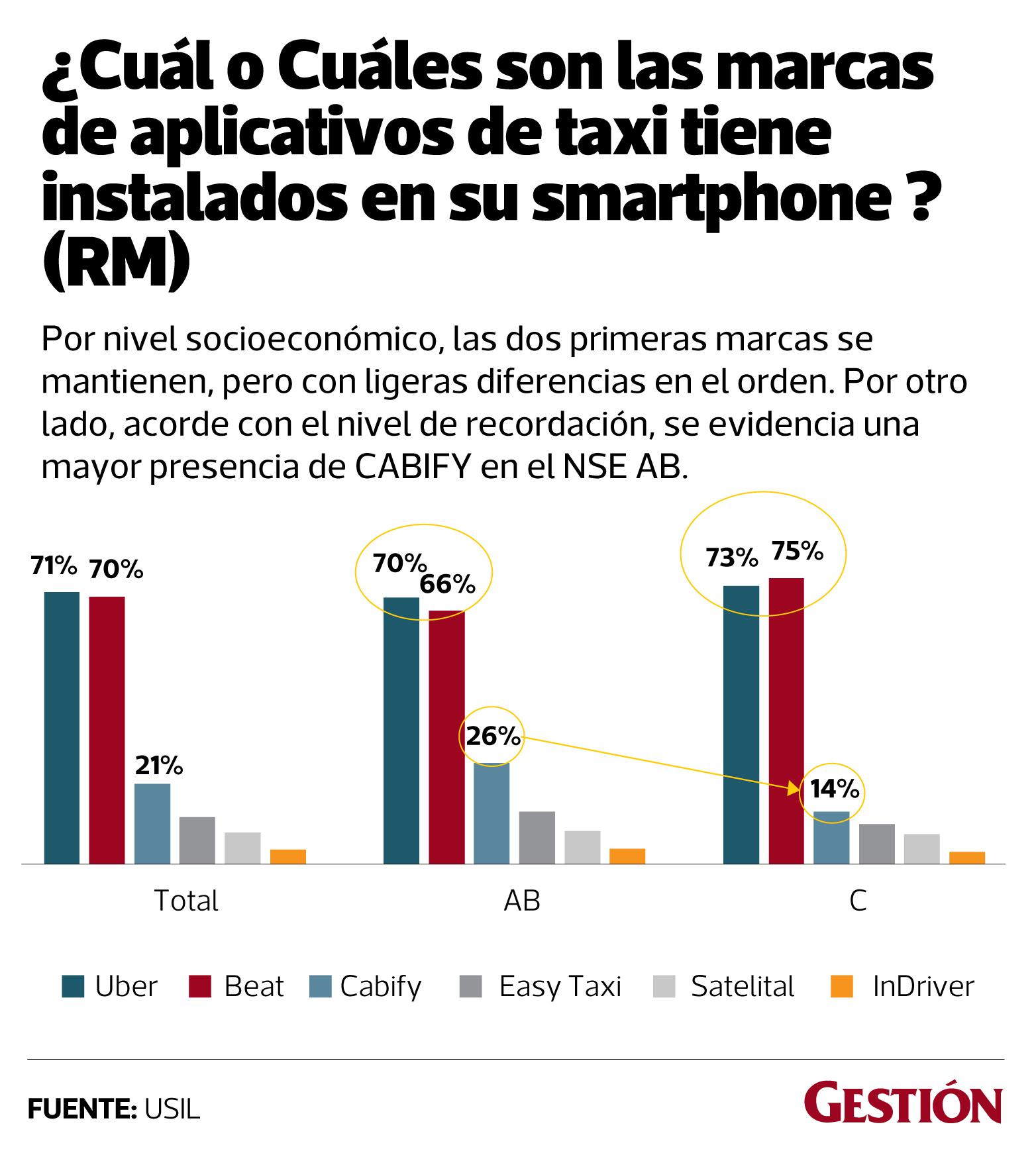 Bajo estas premisas, el estudio indica que tanto Beat como Uber son las marcas más usadas por los limeños. A nivel total, el 85 % se concentra en dichas marcas. En el caso del NSE AB, aparece en tercer lugar Cabify con 12%.