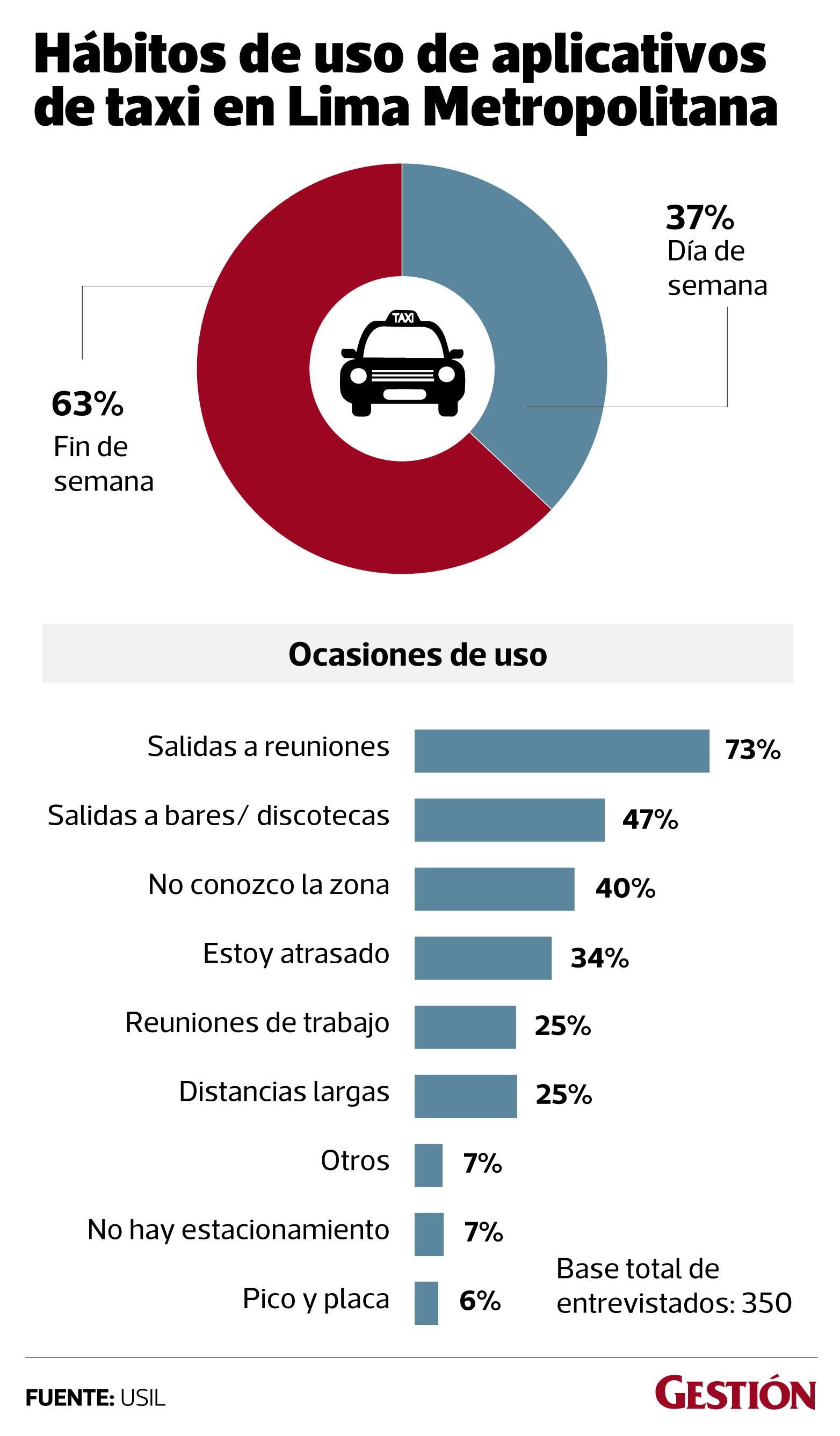 De los siete días de la semana, el uso de los aplicativos de taxi está enfocado en los sábados y domingos (63% de los encuestados). Pero si lo dividimos por NSE, en el AB no hay una diferencia tan marcada en el uso de estos servicios en días normales y fines de semana: un 43% y 57%, respectivamente.