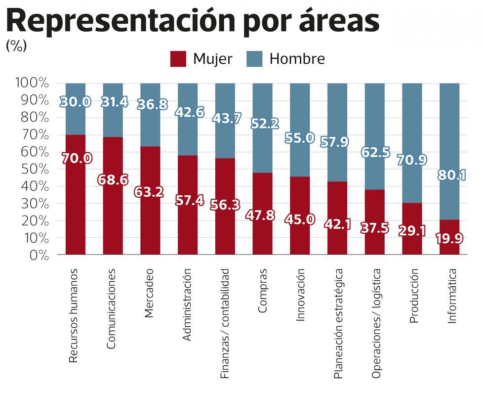 Debido a esto, los hombres suelen estar mayormente representados en áreas centrales al negocio como producción, logística y planeación estratégica, mientras que el sexo femenino se concentra en áreas más de apoyo como recursos humanos, comunicaciones y mercadeo.