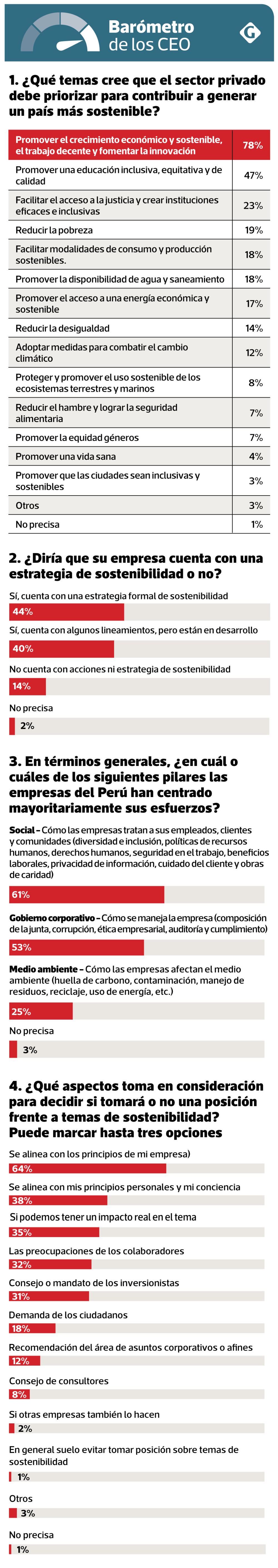 El 78% de los encuestados del Barómetro de CEO también considera que el sector privado debe promover el crecimiento económico, el trabajo decente y la innovación para contribuir a que el Perú sea un país sostenible.