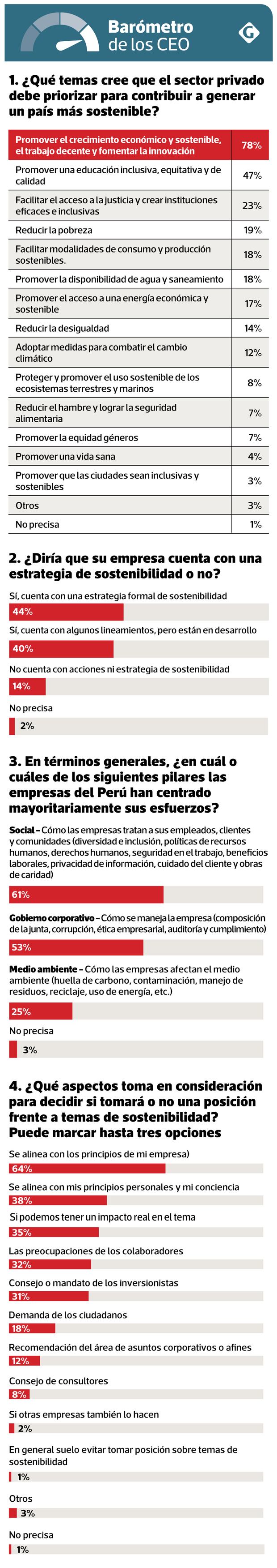 Sin embargo, todavía hay camino por recorrer. Un 44% de los encuestados señaló que sus empresas cuentan con una estrategia formal de sostenibilidad, mientras que un 40% cuenta con lineamientos en desarrollo. “Debemos entender que el privado no solo debe pagar impuestos. Hay un espacio muy grande para contribuir junto al público para darle al país la infraestructura que necesita”, considera Aldo Ferrini, gerente general de AFP Integra.