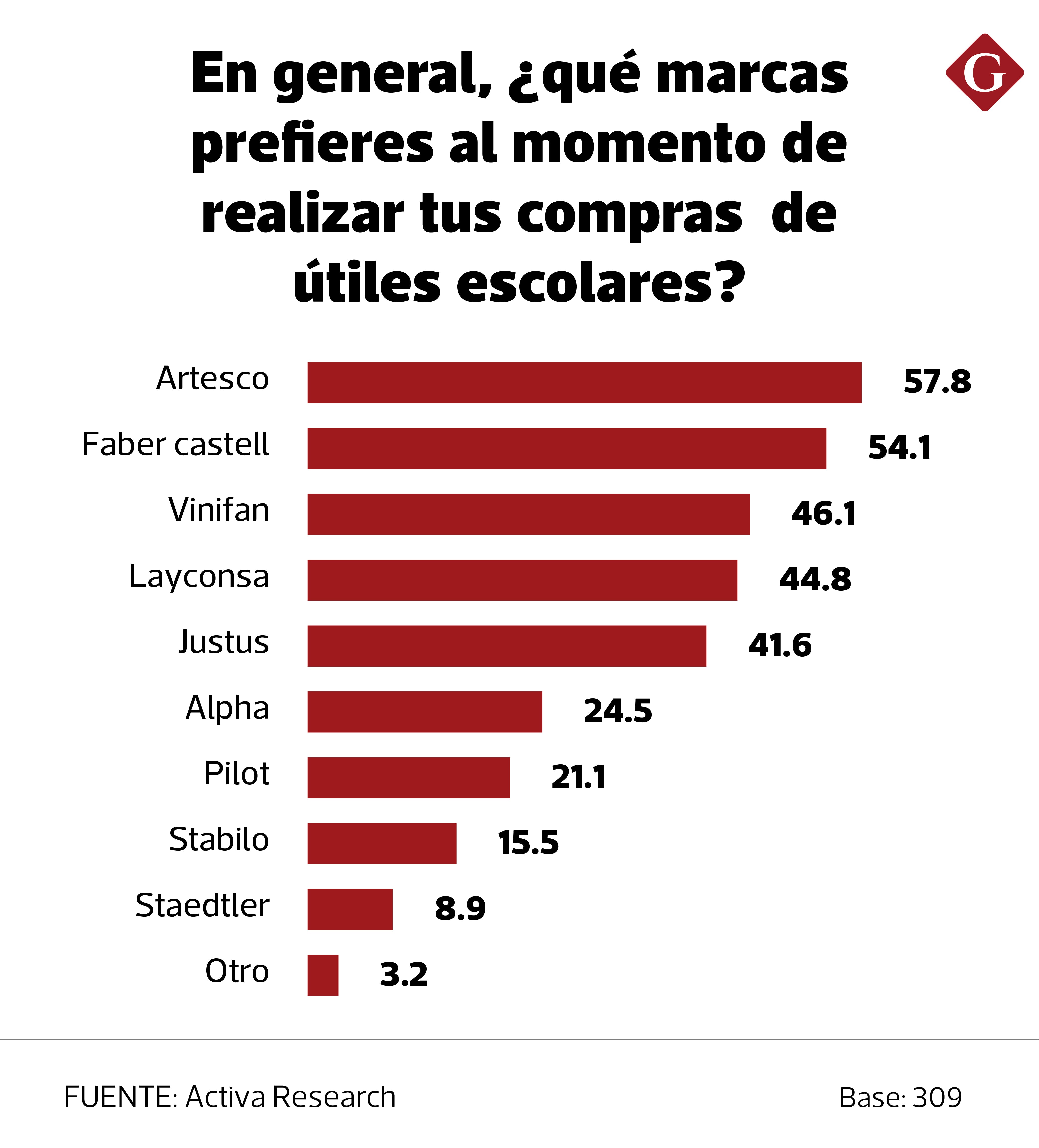 Dentro de las marcas más resaltantes en útiles escolares figuran Artesco, Faber Castell, Vinifan, Layconsa, entre otros. “Estas preferencias lo hemos visto con mayor fuerza en Lima, donde la marca tiene un poco más de peso; probablemente, porque haya colegios que sugieran marcas”, agregó.