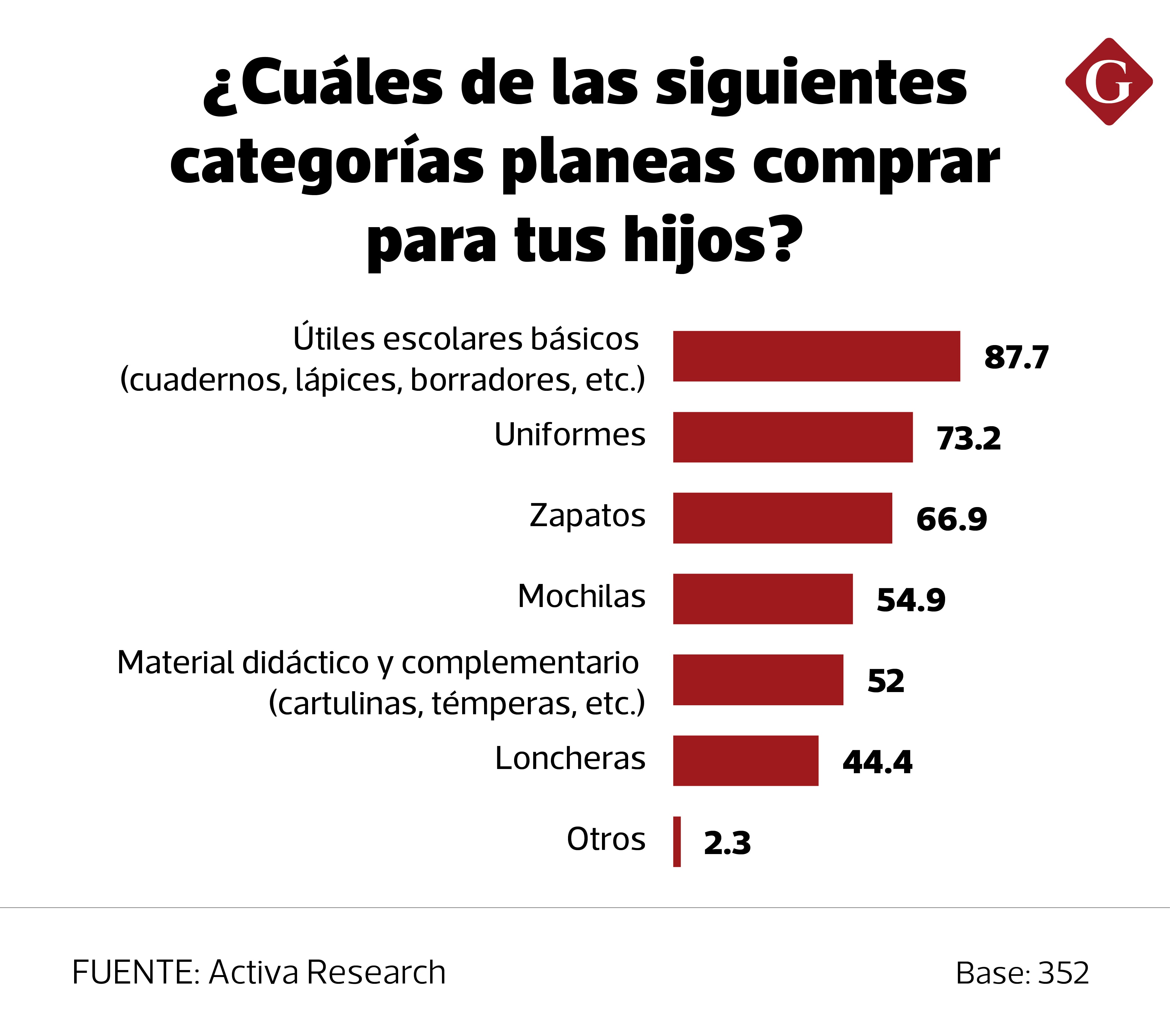 En torno a las categorías que se adquirirán con preponderancia este año se encuentran útiles escolares como cuadernos, lápices, borradores y demás (87.7%); uniformes (73.2%); zapatos (66.9%); mochilas (54.9%); entre otros.