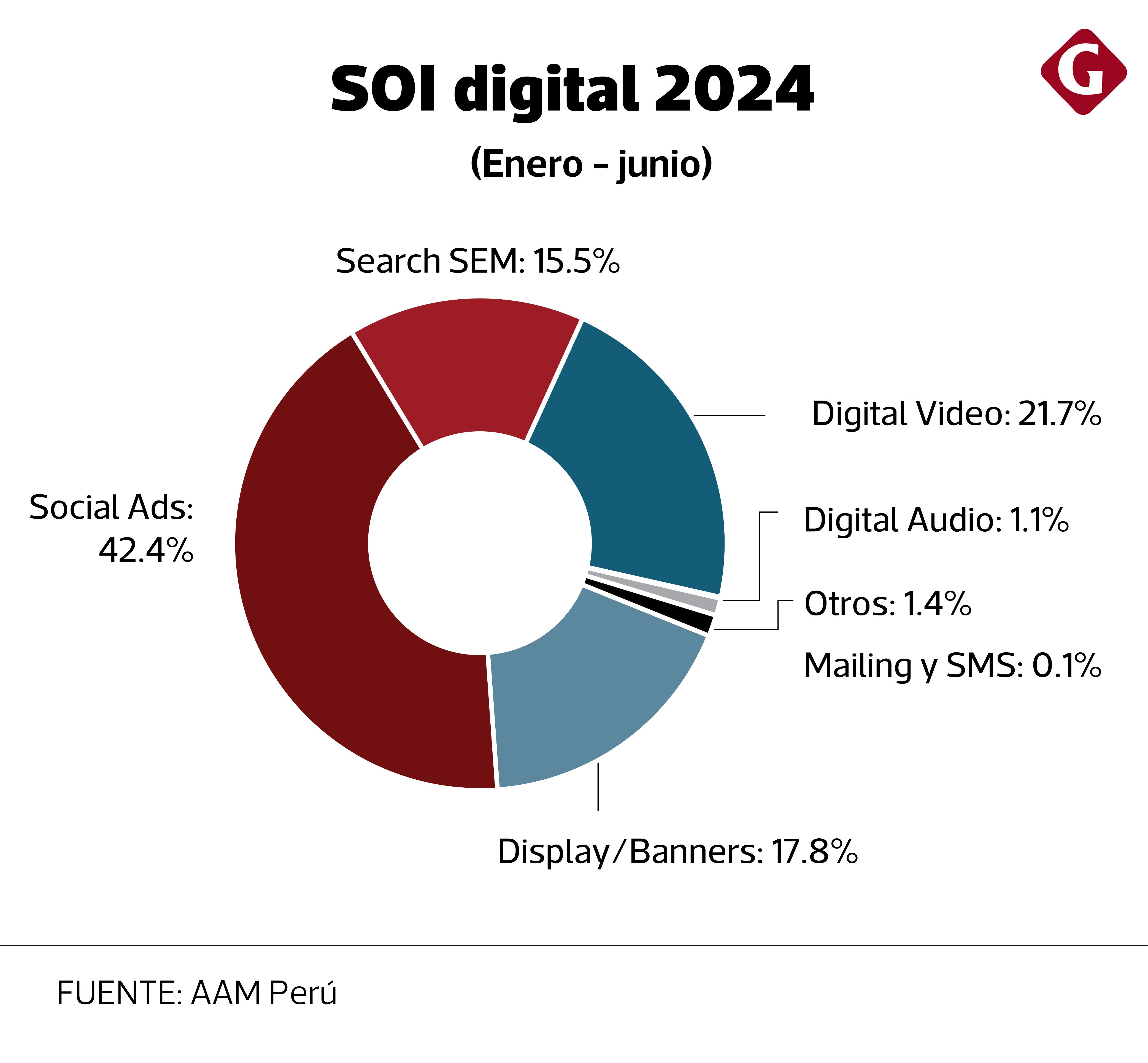 ¿En qué se invierte? Según el estudio, de los US$ 102 millones dirigidos a la publicidad digital en el primer semestre, el 42.4% está destinado a los anuncios en redes sociales, conocidos como social ads, mientras que el 21.7% de los recursos van al digital video, un 17.8% al display/banners (anuncios gráficos en los sitios web) y un 15.5% se distribuye a la publicidad de buscadores como Google (Search SEM).