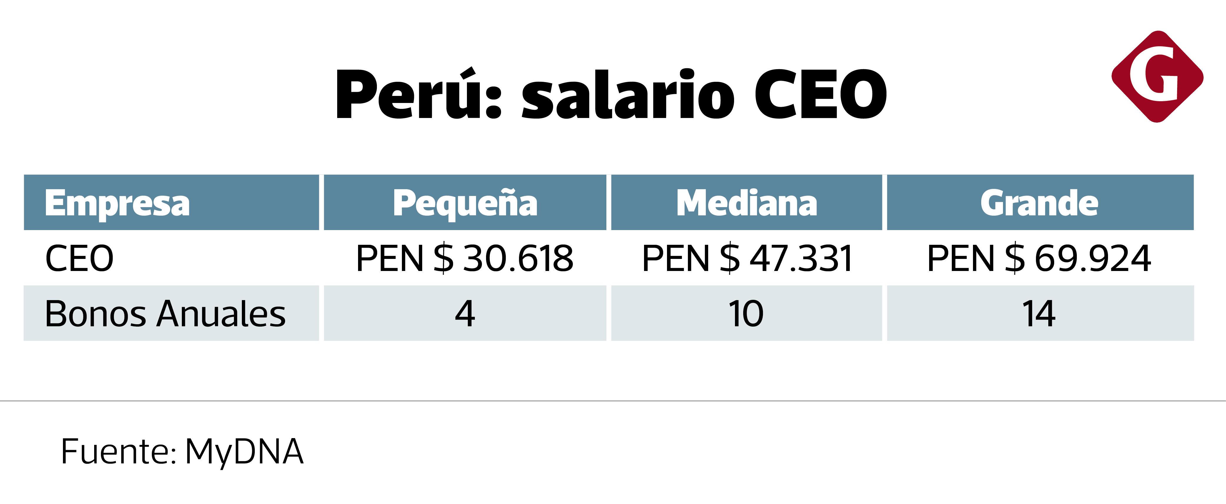 Según MyDNA, un CEO peruano, dependiendo del tamaño de la compañía, tiene un sueldo promedio mensual de entre S/ 30,618 y S/ 69,924; además, de bonos y otros beneficios propios de su cargo y del rendimiento de la empresa.