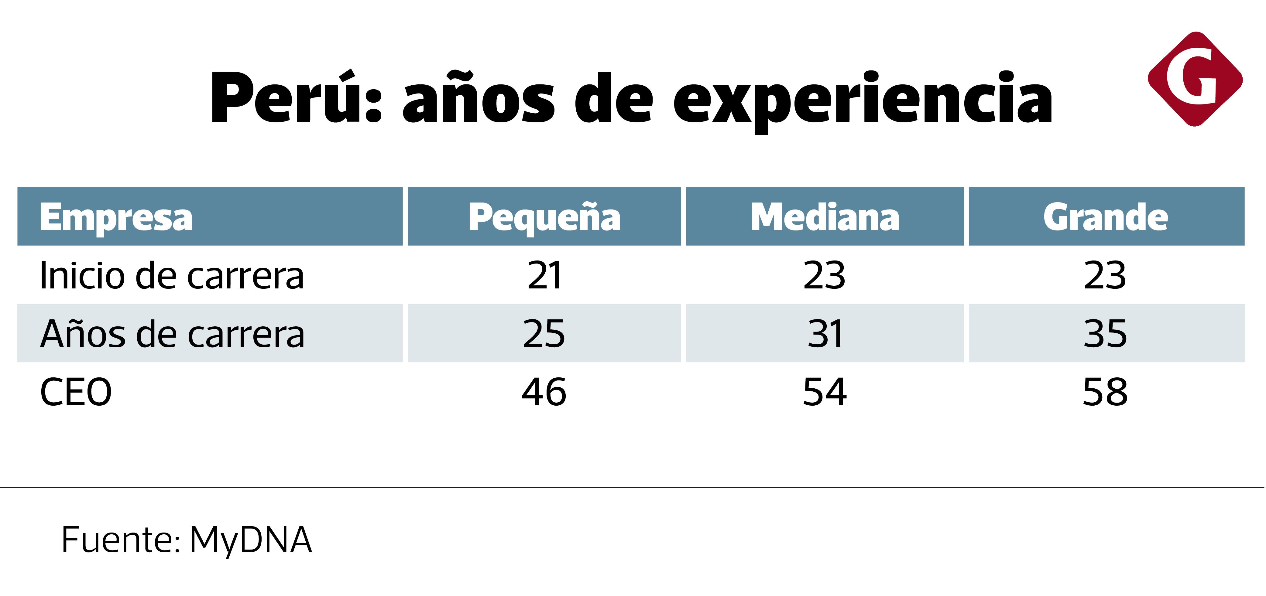 De acuerdo al Estudio Perfiles de los CEOs en Latam 2024, elaborado por MyDNA —que recoge información en total de 3,000 CEOs de Brasil, Colombia, Argentina, Chile y Perú—, en promedio, un ejecutivo peruano tarda 30 años antes de convertirse en CEO. A diferencia, profesionales de Chile demoran 26 años en lograr esta posición, mientras que ejecutivos de Argentina muestran rangos menores con incluso 25 años.