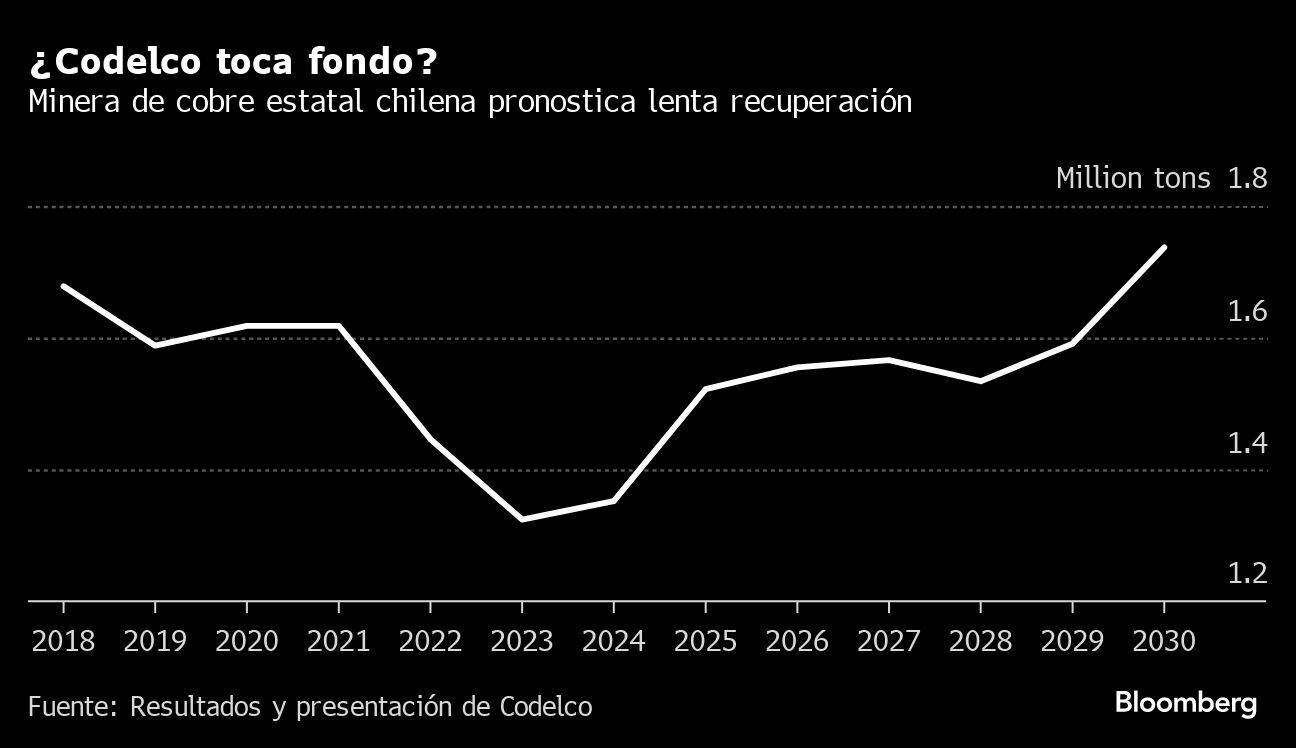 Fitch Ratings bajó la calificación crediticia de Codelco a BBB+ en noviembre y S&PGR la redujo al mismo nivel el mes pasado. El centro de investigación Cesco ha advertido que la deuda de la empresa podría aumentar de unos US$ 20,000 millones actuales a US$ 30,000 millones para fines de la década. El nuevo presidente ejecutivo, Rubén Alvarado, ha dicho que prevé una recuperación gradual de la producción a partir de este año.