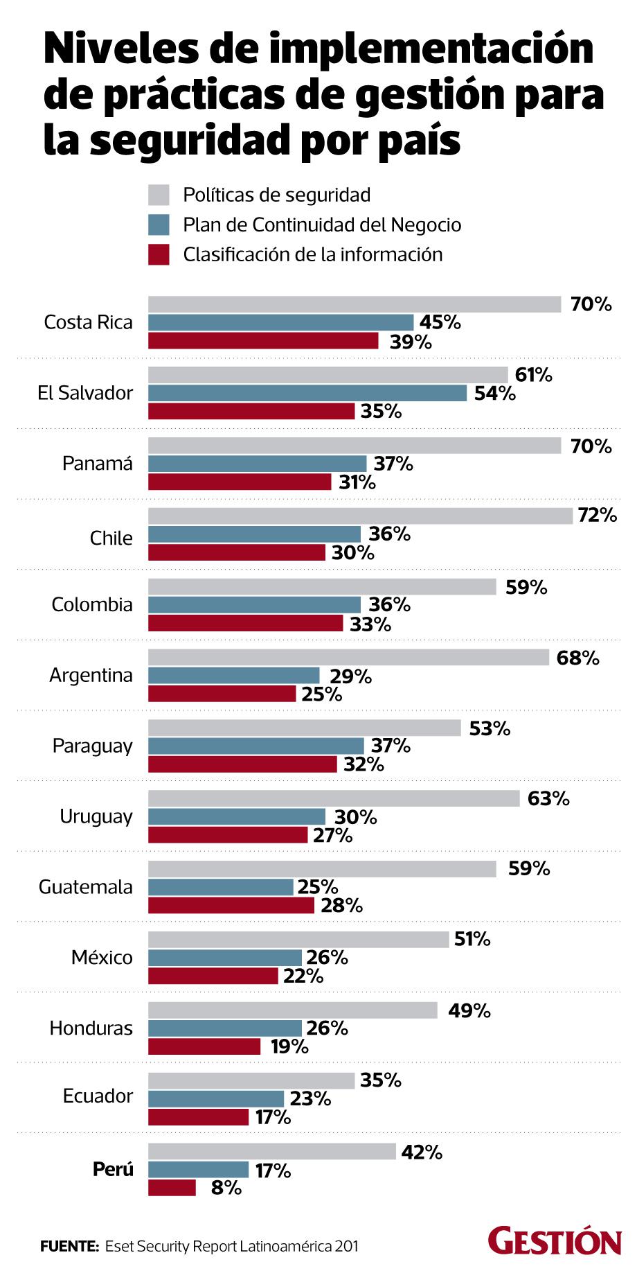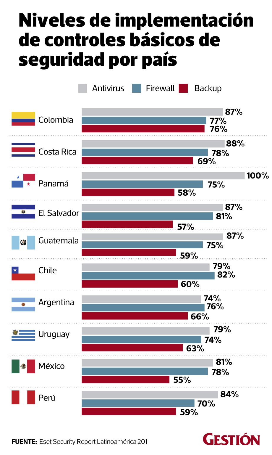 En el caso peruano, el 84% de empresas implementan el antivirus, 70% un firewall y 59% un backup.