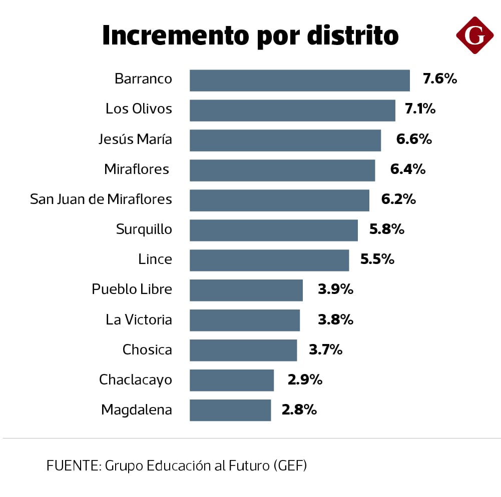 En el otro extremo, los menores incrementos se concentran en Chaclacayo (2.9%), Magdalena (2.8%), Chosica (3.7%), La Victoria (3.8%) y Pueblo Libre (3.9%), distritos donde la presión por vacantes es menor, según el análisis.