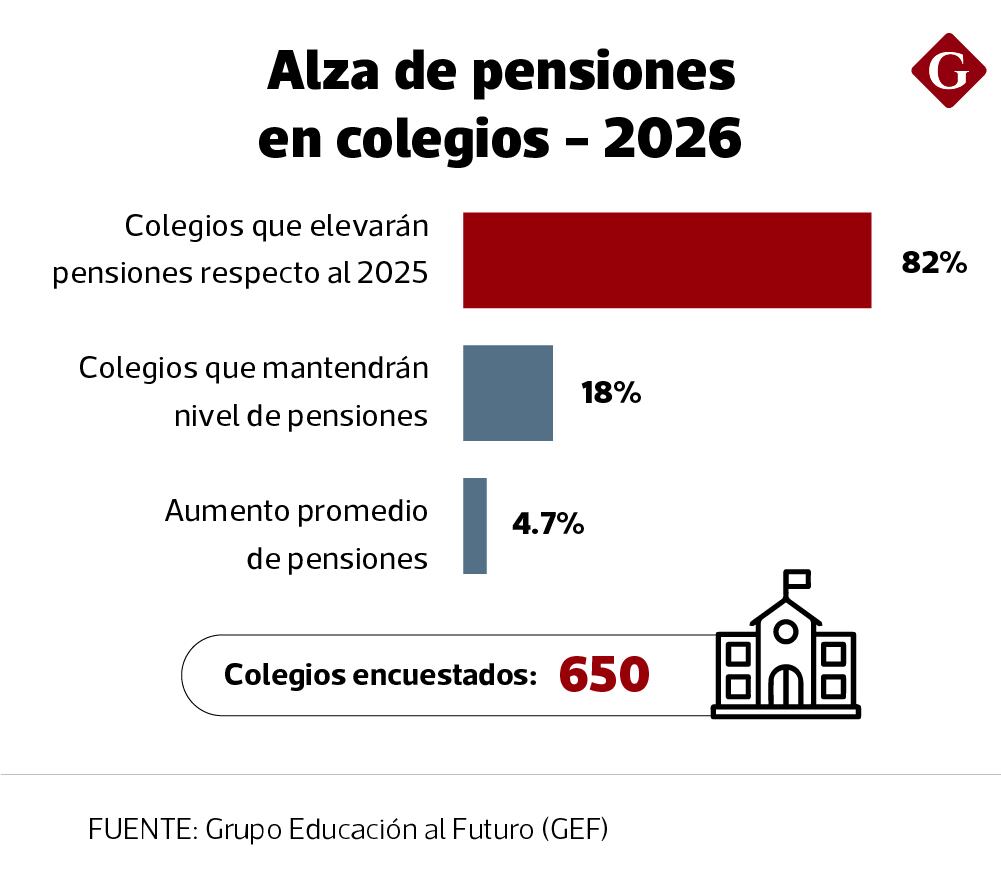 De acuerdo con el análisis de la Guía educativa, las pensiones para el año lectivo 2026 registraron un aumento promedio de 4.7%, frente al 4.6% del 2025. “Desde la pandemia, los colegios enfrentan dificultades en el cobro de pensiones, a lo que se suma el aumento de los costos del servicio educativo y el sueldo bajo de los docentes de colegios más pequeños es un factor que presiona por subir la pensiones”, indicó a Gestión Justo Zaragoza, director de GEF.