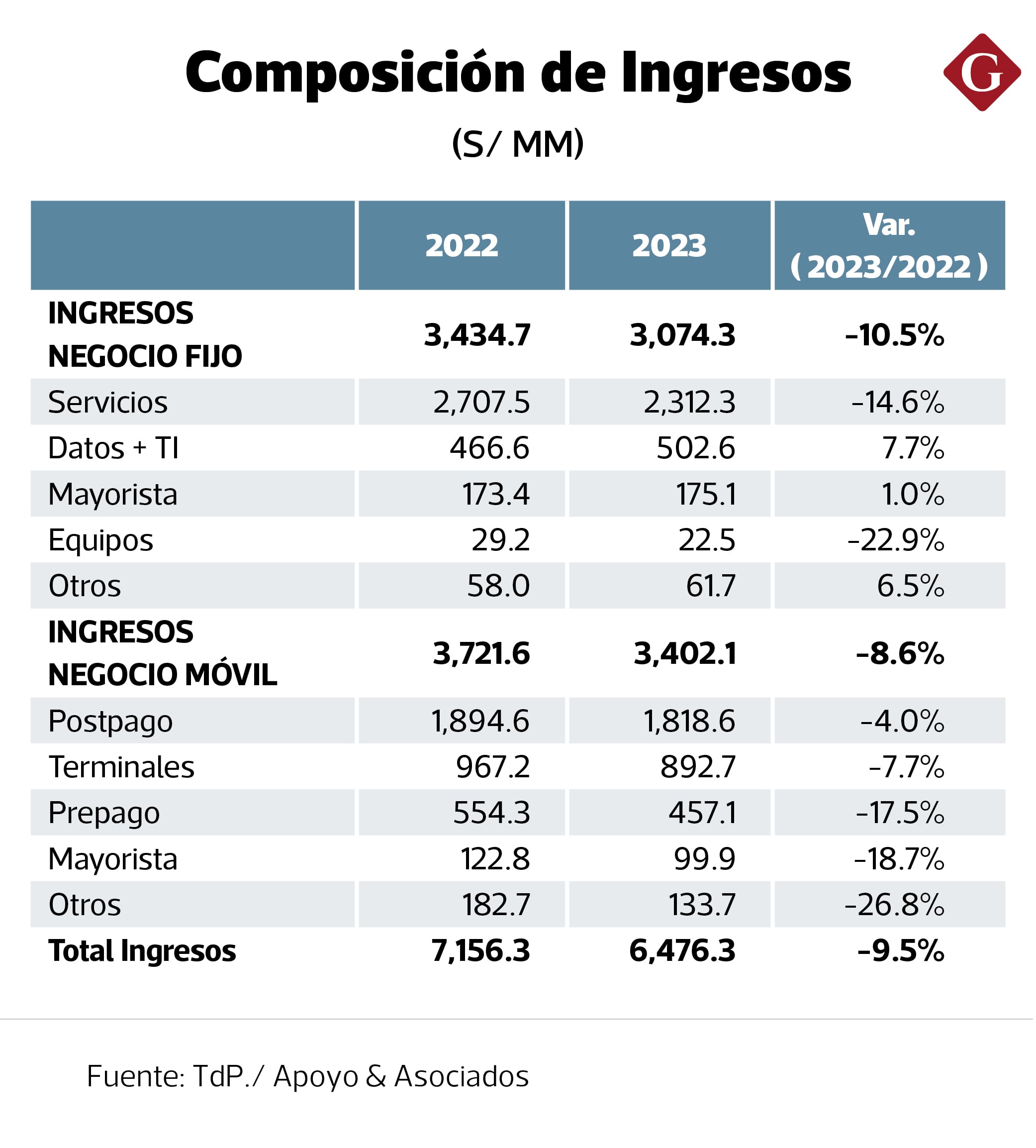 ¿Qué está generando los resultados adversos? Actualmente, la estructura de ingresos de TdP se divide en dos negocios: el móvil (52.5% del total de ingresos), y e fijo (47.5% del total de ingresos). Julio Loc, director de Apoyo & Asociados, explicó a Gestión que en el segmento fijo uno de los factores que afecta a la operación es la transición tecnológica hacia la fibra óptica, que está siendo aprovechada por operadoras no tradicionales al ofrecer alternativas más accesibles y dinámicas. “En muchos casos, los clientes han migrado hacia operadoras que ofrecen mejores opciones en cobertura y velocidad”, señaló Loc.