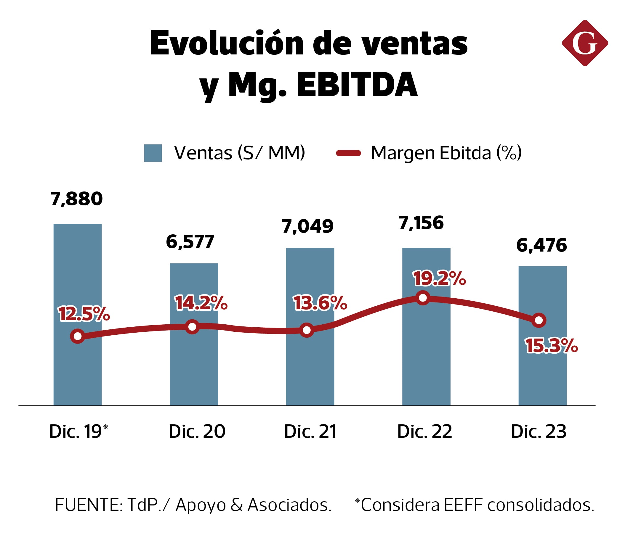 La caída de ingresos en Telefónica del Perú no es un fenómeno reciente, sino una tendencia de cinco años. Entre 2019 y 2020, los ingresos bajaron de S/7,800 millones a S/6,600 millones. Aunque entre 2021 y 2022 hubo una recuperación de S/7,049 millones a S/7,156 millones, en 2023 volvieron a caer a S/6,476 millones. Esta tendencia también se refleja en la rentabilidad: el margen EBITDA pasó del 19.2% en 2022 al 15.3% en 2023. Excepto en 2019, cuando el margen alcanzó el 19.2%, este indicador se ha mantenido por debajo de los niveles observados en años previos a 2018.