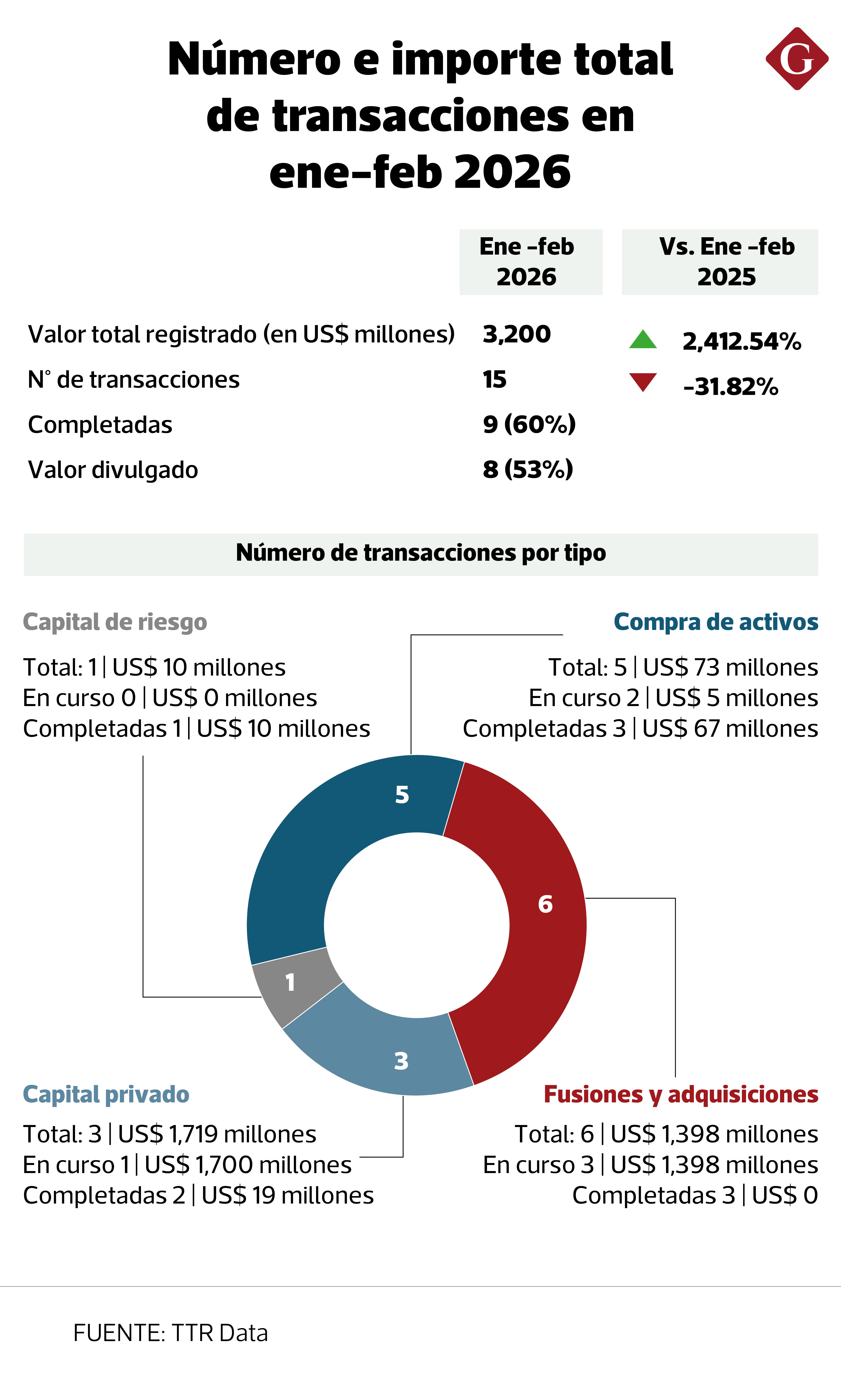 Según información de la consultora Transactional Track Record (TTR), al cierre de febrero se han registrado 15 transacciones por un valor de US$ 3,200 millones, lo que significa como número de deals una contracción de cerca de 32%, pero un incremento de aproximadamente 2,413% en comparación a la actividad de los dos primeros meses del 2025. En este periodo, la operación clave por su ticket fue la de la canadiense CPP Investments (Canada Pension Plan Investment Board), la cual anunció la adquisición por un valor de US$ 1,700 millones del 50% de Inkia Energy, empresa que controla activos energéticos en el Perú y otros mercados.