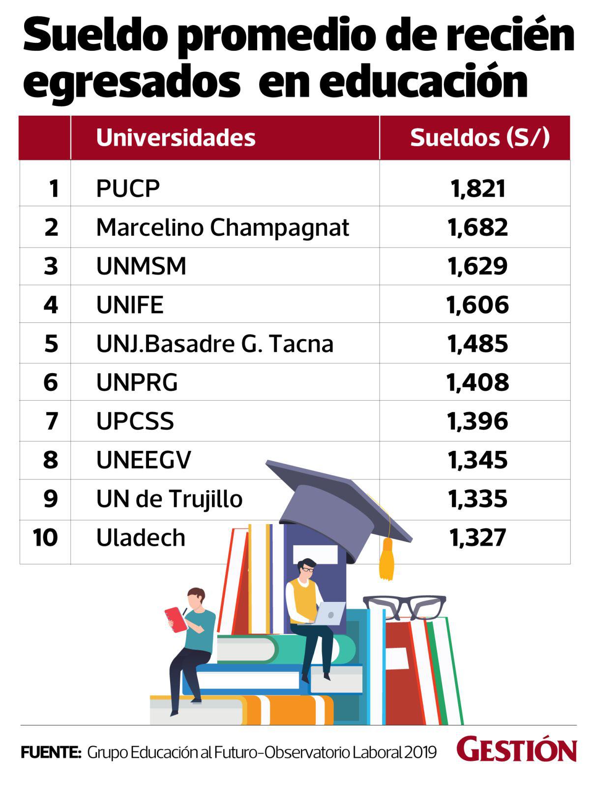 Así detalló, los recién egresados de la PUCP, que son los que reciben los sueldos más altos en Educación, llegan a ganar en promedio S/ 1,821.