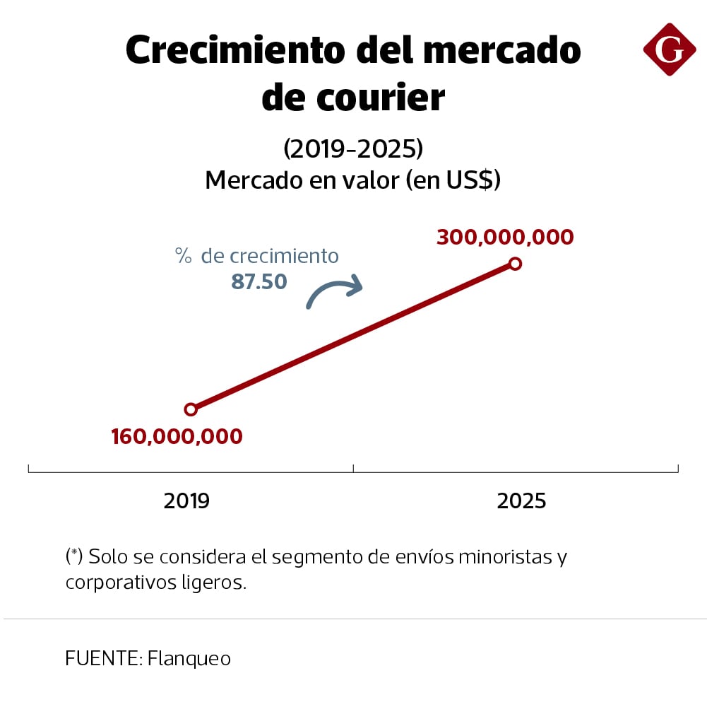 Según el estudio, el mercado logístico de última milla y mensajería en Perú —considerando los envíos minoristas y corporativos ligeros— mueve hasta US$ 300 millones anuales, lo que indica que el tamaño del negocio casi se ha duplicado, con un crecimiento superior al 87.50% desde 2019.