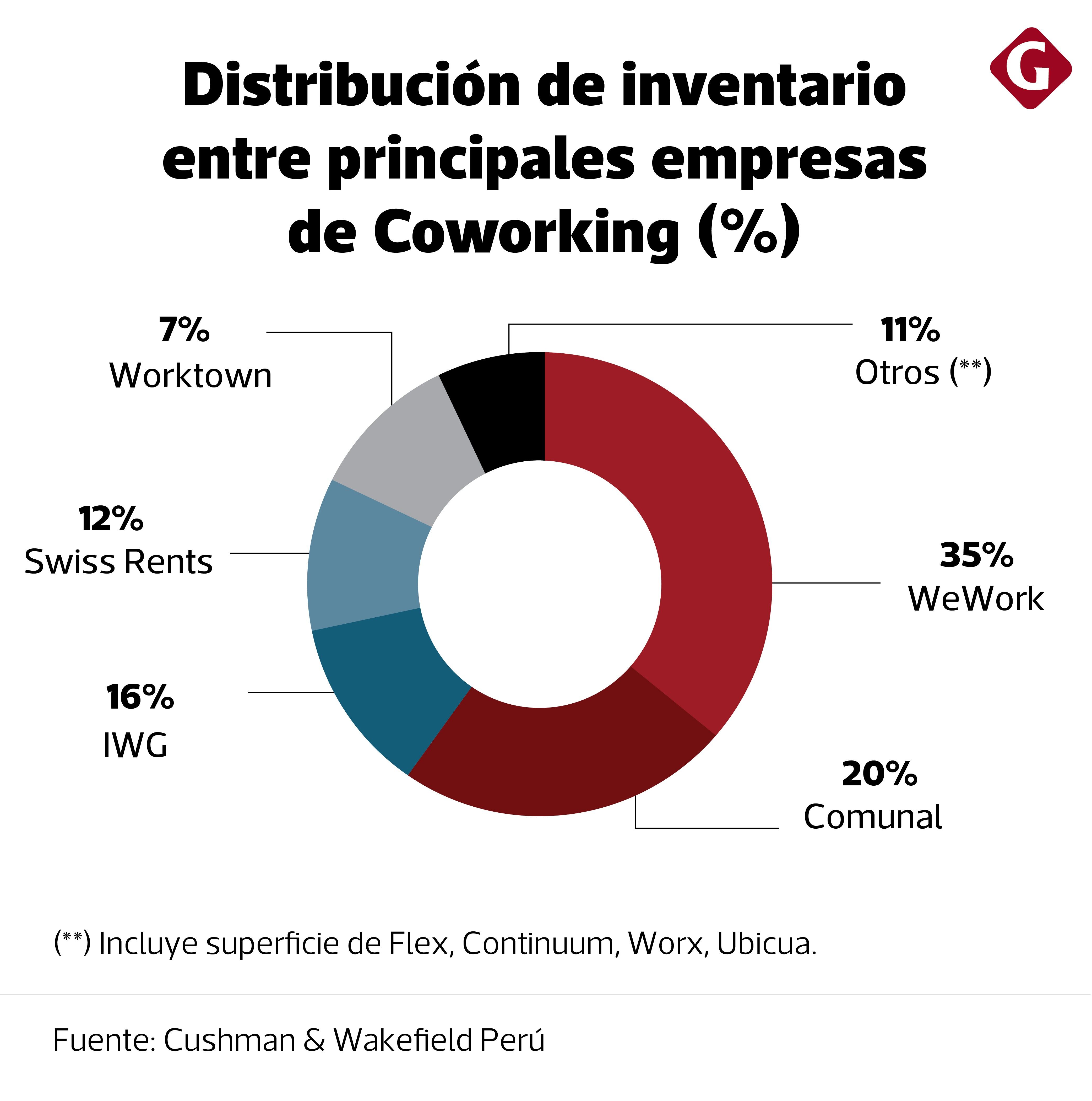 Así, más del 70% del mercado local está distribuido entre tres operadores: WeWork (35,765 m2) , Comunal (20,969 m2) e IWG (13,366 m2), considerando una vacancia de 30%, 18% y 29%, respectivamente.