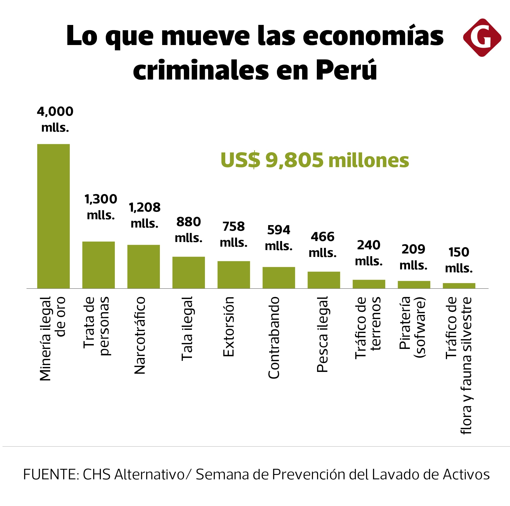 Segun la asociación CHS, que se basa en datos de un informe de Konrad Adenauer, las economías criminales representan un total de US$ 9,805 millones en el Perú, siendo lideradas por la minería ilegal de oro (US$ 4,000 millones), seguidas por la trata de personas (US$ 1,300 millones) y el narcotráfico (US$ 1,208 millones).