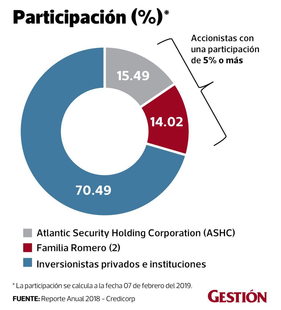 Por su parte, Atlantic Security Holding Corporation (ASHC) tiene el 15.49%, mientras que la familia Romero tiene el 14.02% de las acciones, que abarcan directa o indirectamente de propiedad de Dionisio Romero y su familia o de compañías de su propiedad o representada por él.