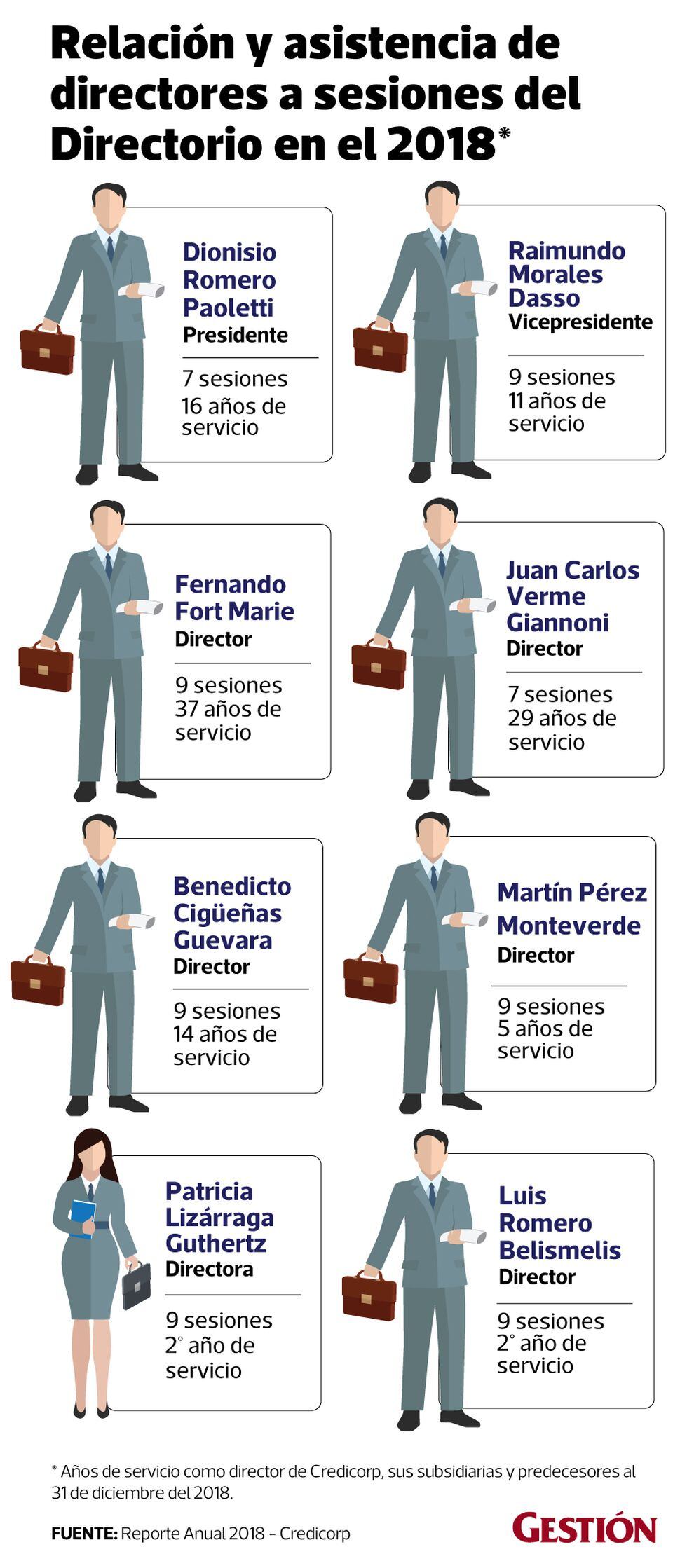 El directorio sesiones una vez al mes, con un quórum establecido equivalente a la mitad más 1 de sus miembros. En el 2018 se realizaron 10 sesiones. En la Junta Obligatoria Anual de Accionistas, celebrada en marzo del 2017, se escogieron a los nuevos miembros del directorio, quienes ostentarían el cargo de director de Credicorp por el próximo período de tres años, hasta marzo del 2020.