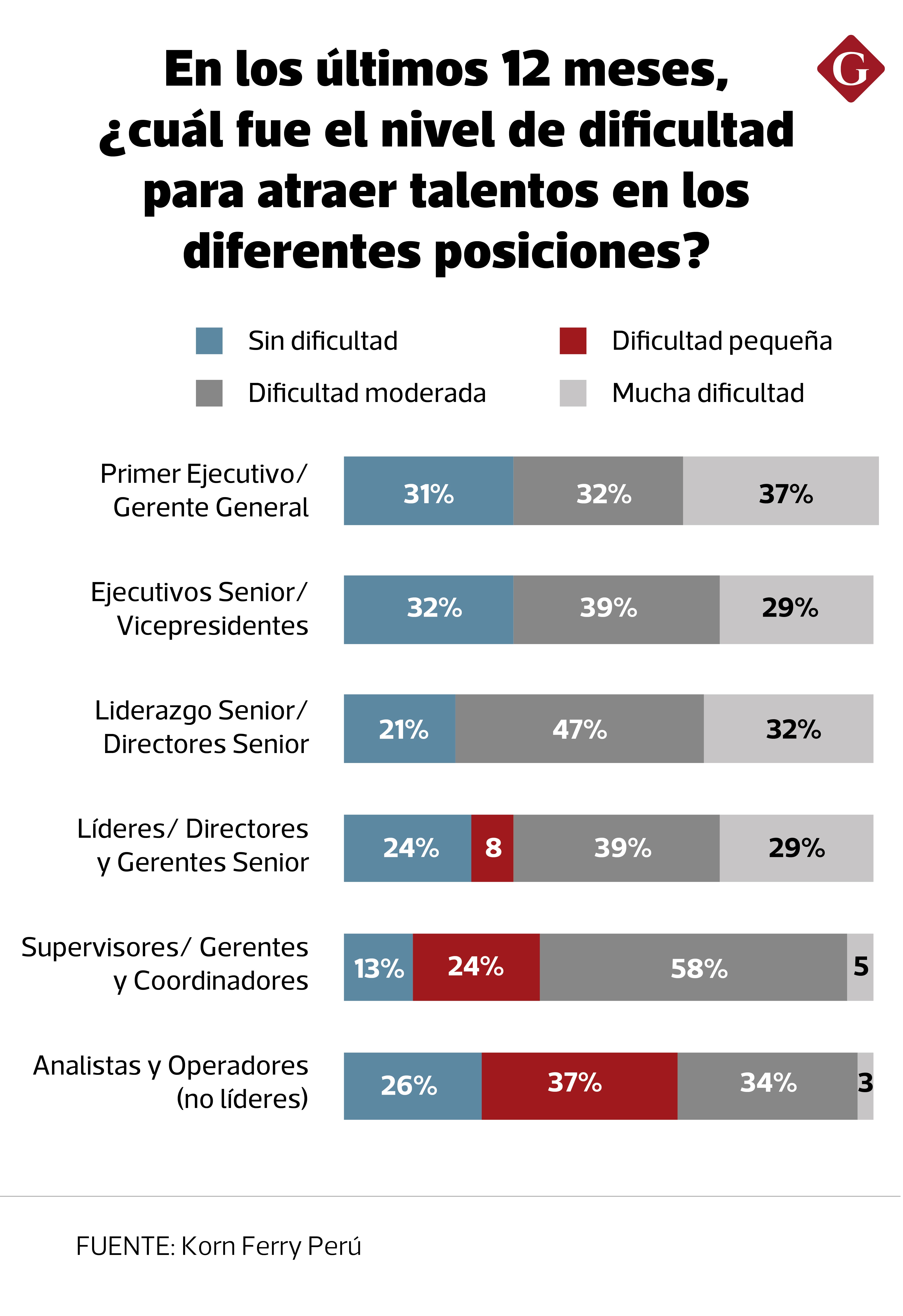 Junto con la dificultad que existe para encontrar ejecutivos con perfil de gerente general, otras posiciones que también mantienen este rango de complicación para su hallazgo en el mercado peruano son directores, gerentes senior y vicepresidentes.