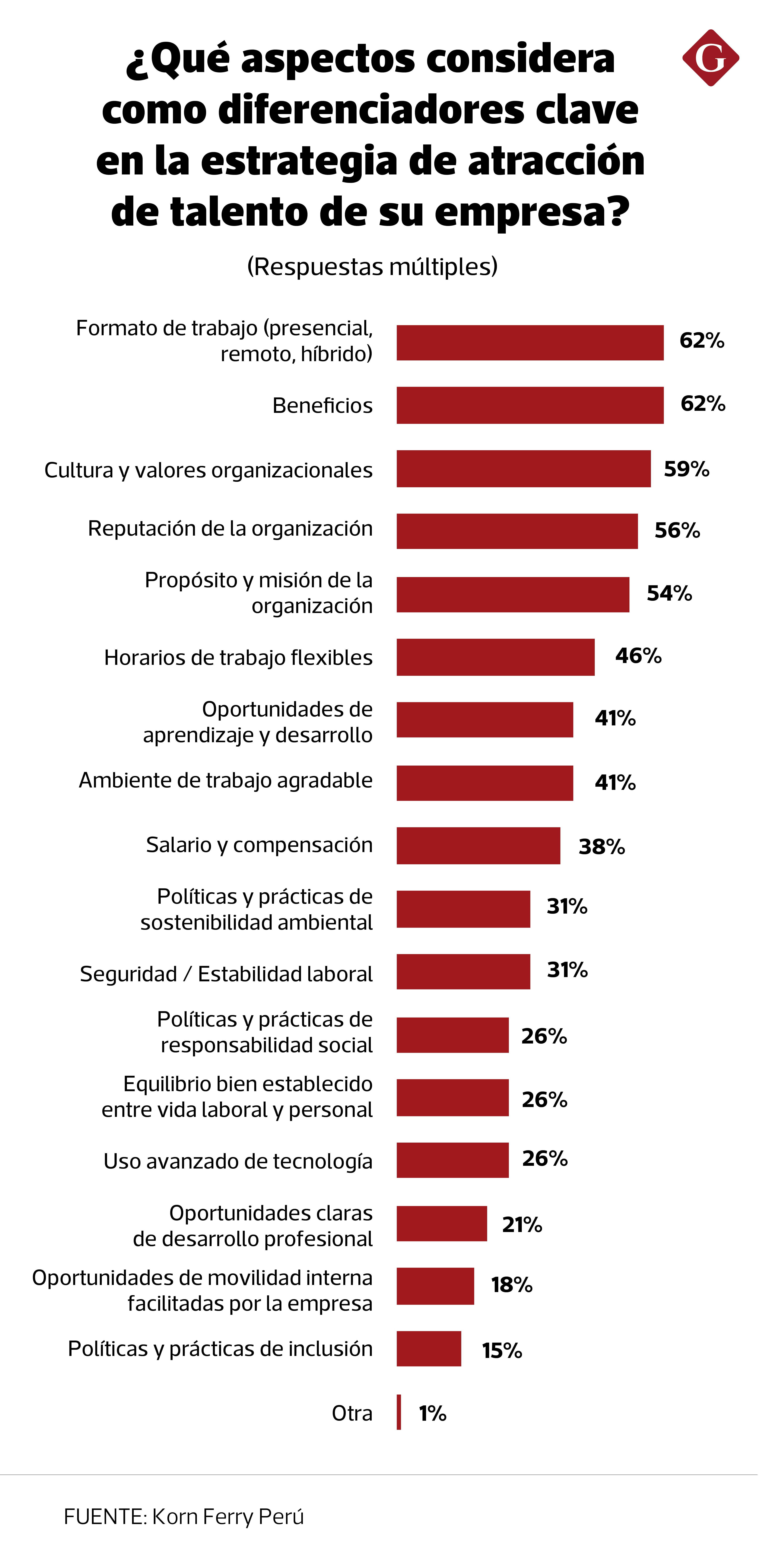 El estudio de Korn Ferry Perú también resaltó que 62% de empresas identifica el modelo de trabajo como el factor más relevante en su estrategia de atracción de talento, superando a variables tradicionalmente determinantes como la compensación económica (38%) o la estabilidad laboral (31%).